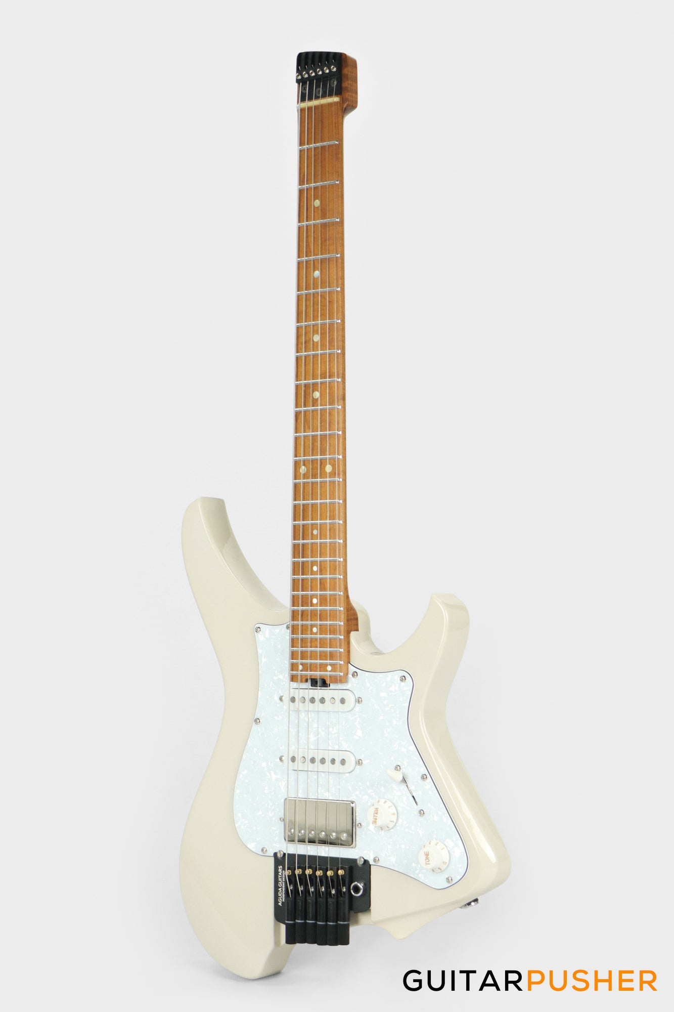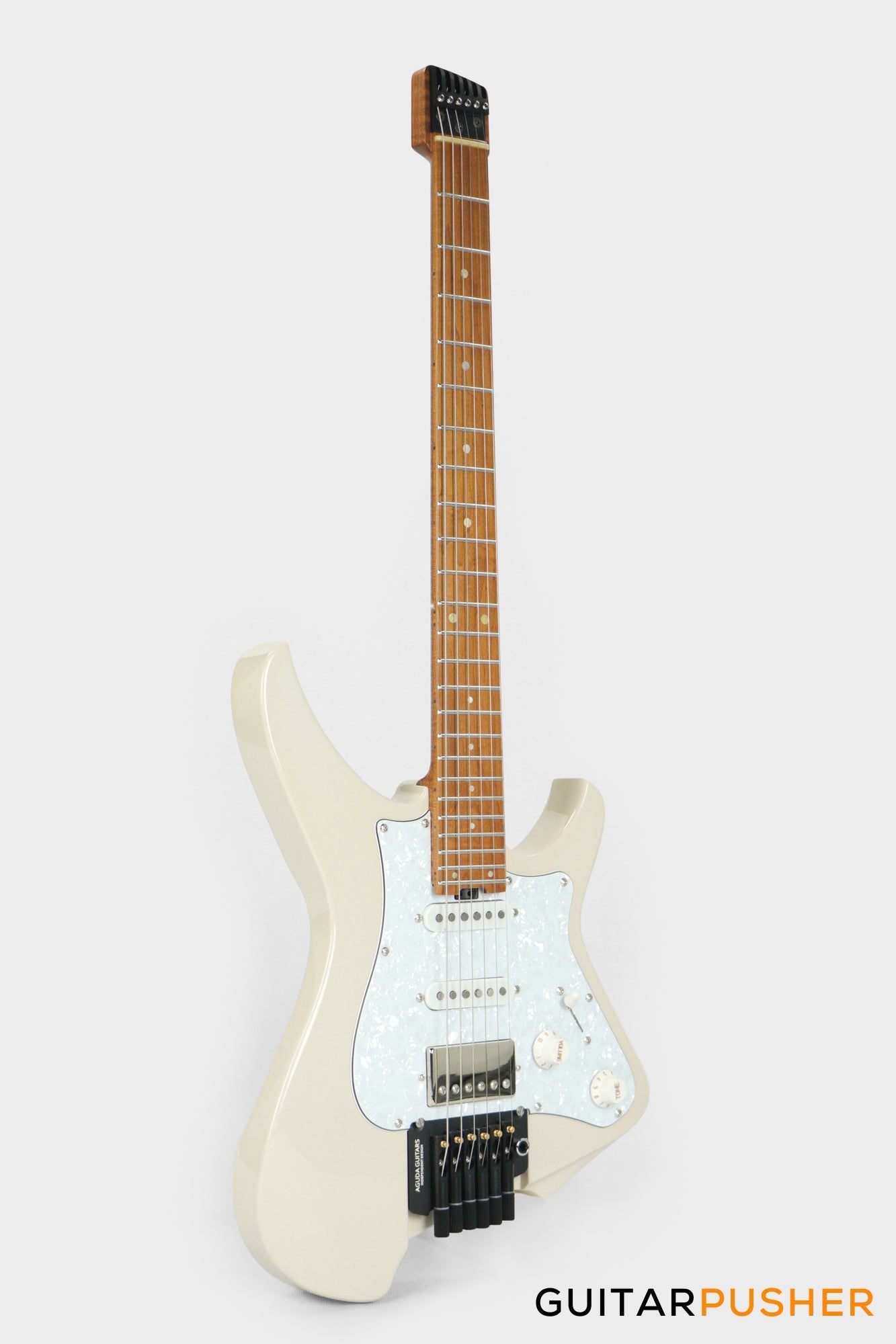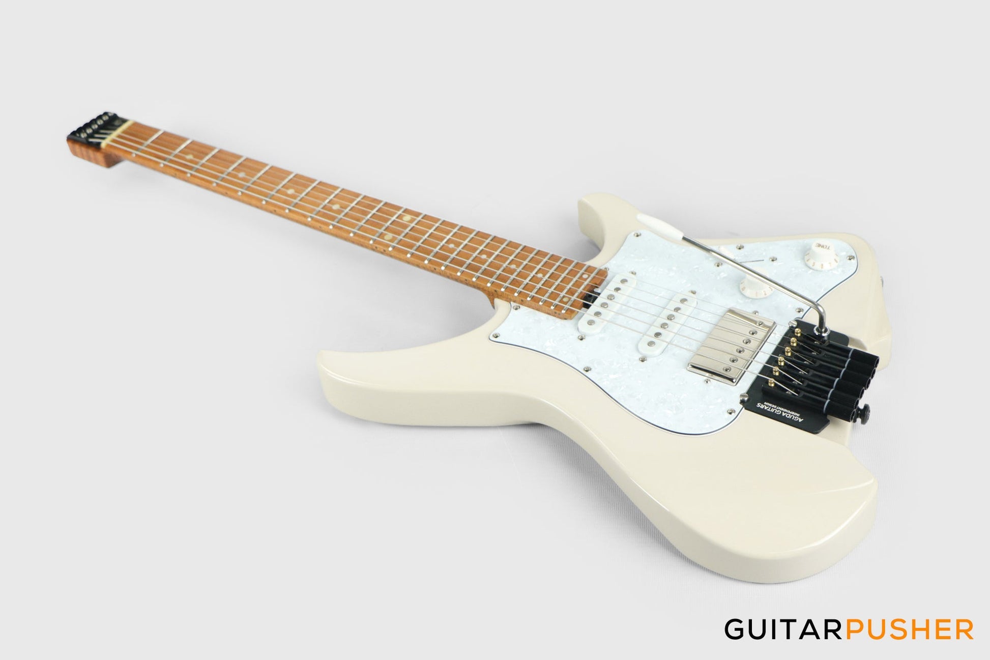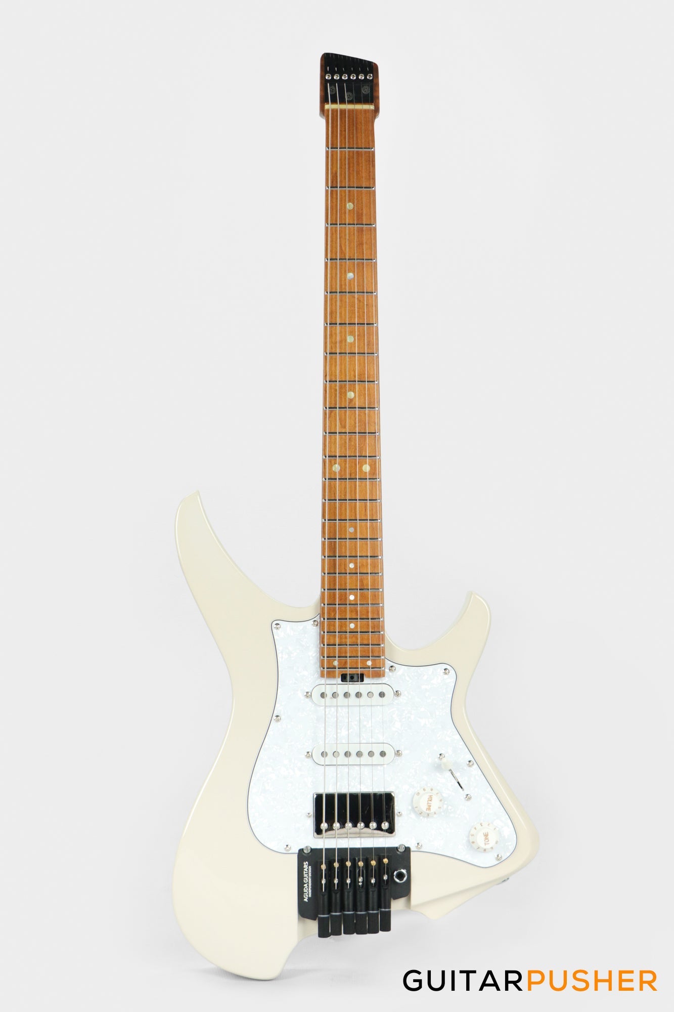 Aguda Musicboy Pro Headless Electric Guitar Alder Body Roasted Maple Fretboard - Olympic White w/ Pearloid Pickguard