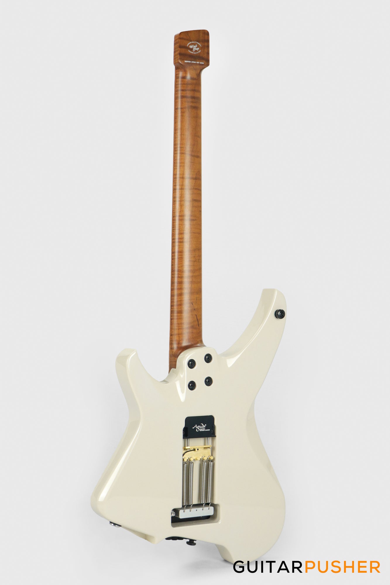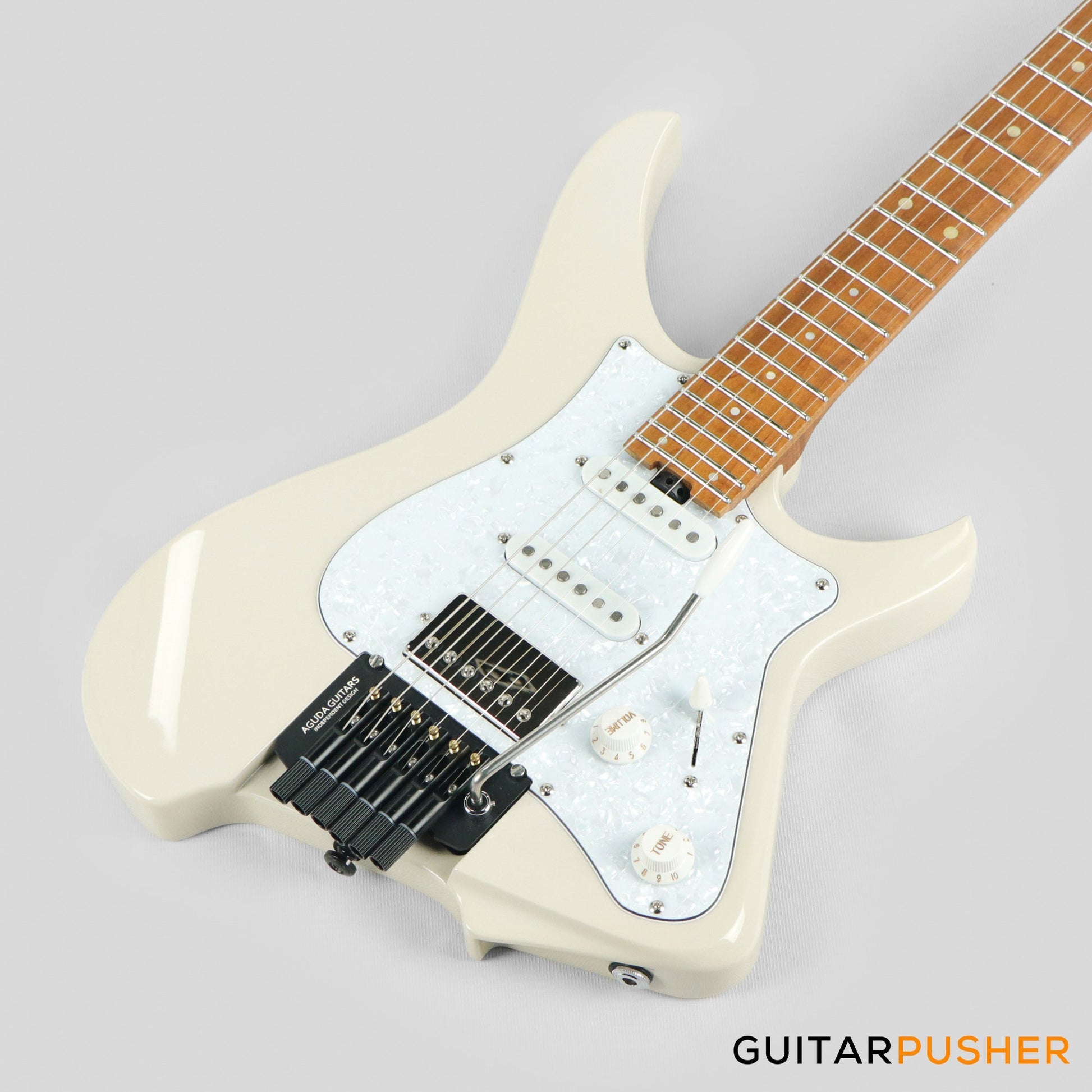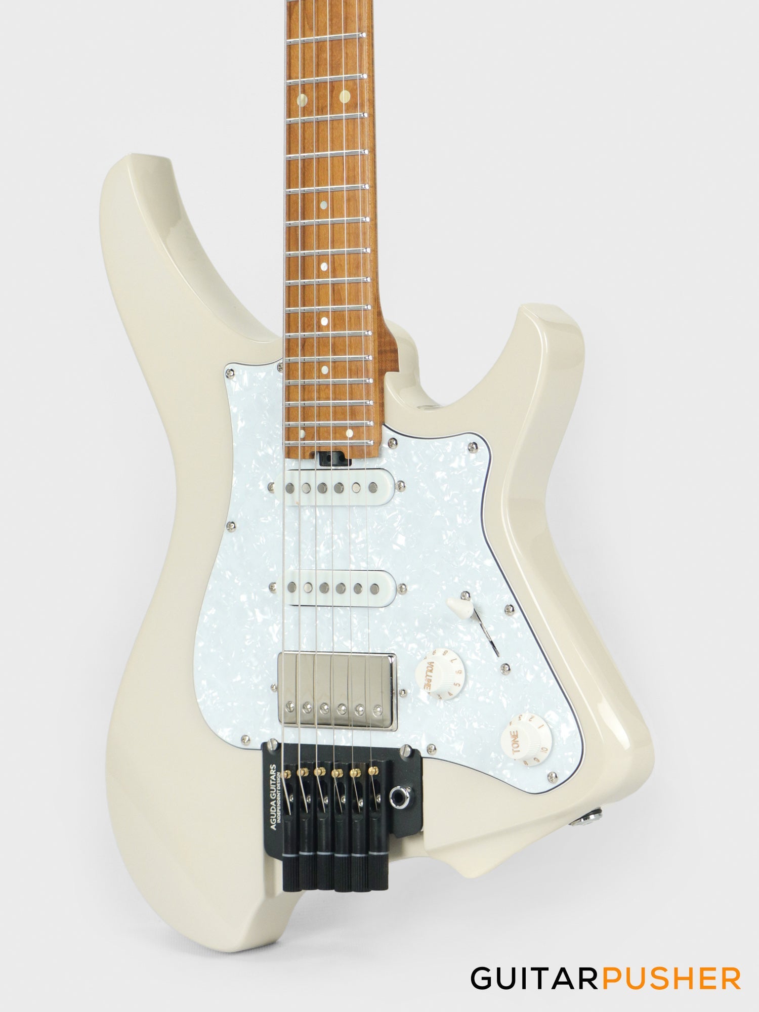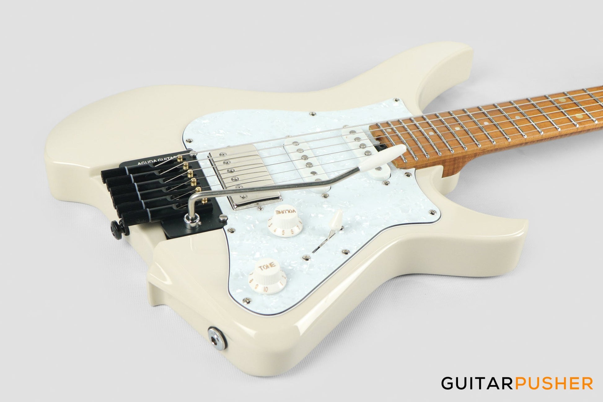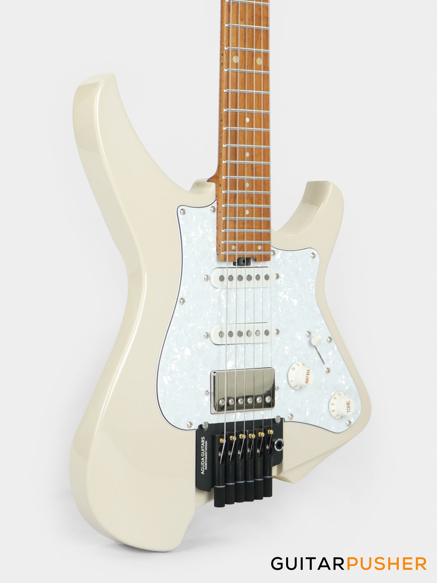 Aguda Musicboy Pro Headless Electric Guitar Alder Body Roasted Maple Fretboard - Olympic White w/ Pearloid Pickguard