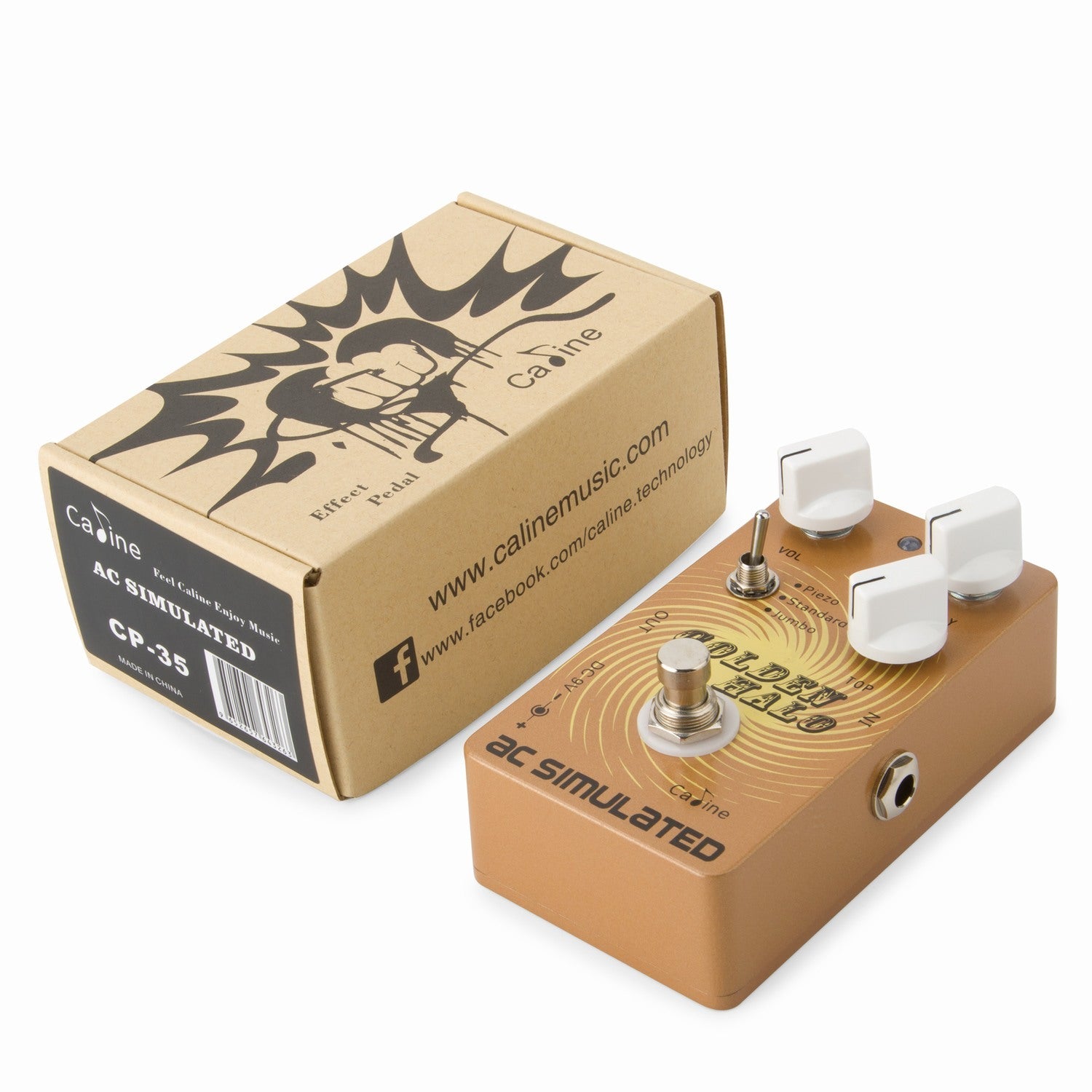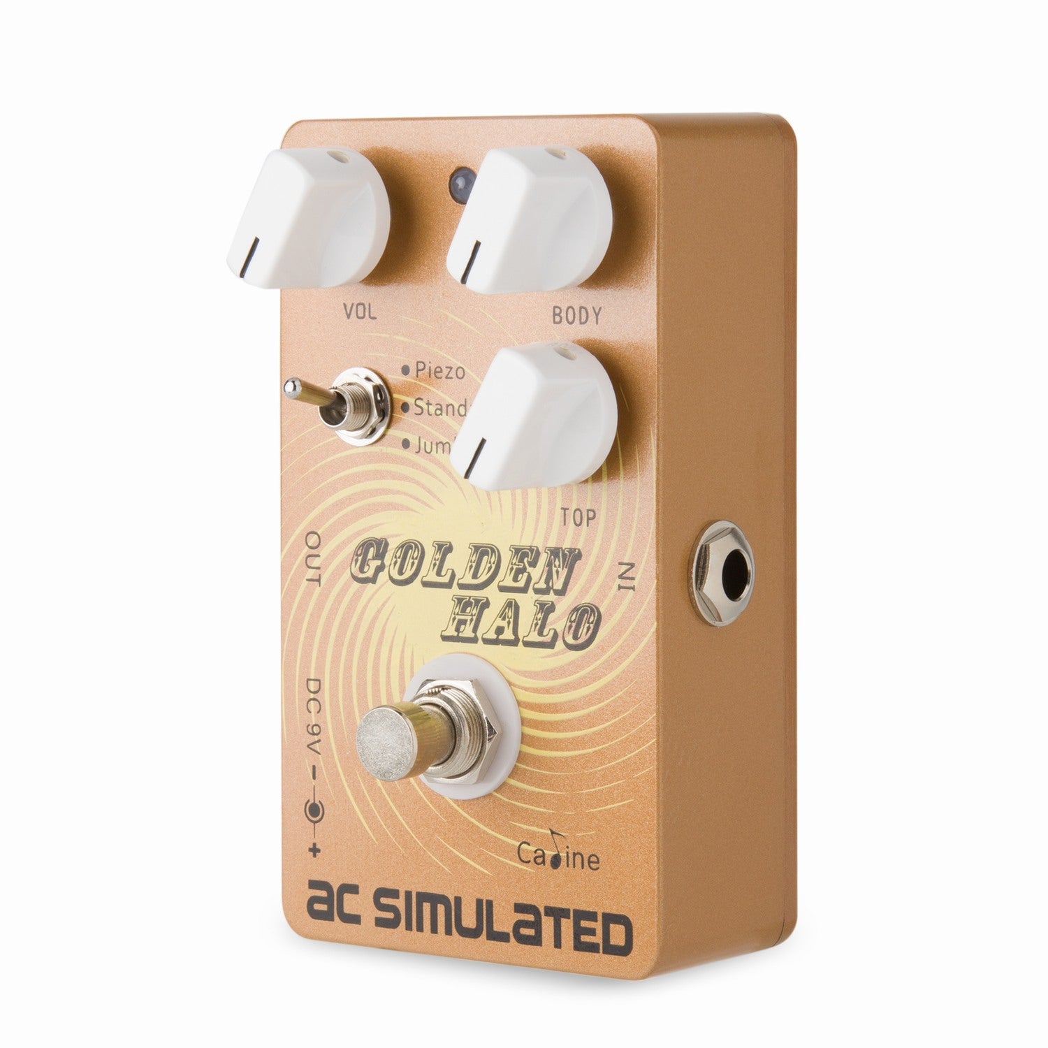Good sounding acoustic simulator pedals are very hard to come, especially at a good price. However the Golden Halo by Caline can give you some incredibly authentic sounding acoustic tones at a very low price. The Top control adjusts the high end and Body simulates the actual resonance of the guitar body. Volume obviously controls the volume. The 3 way selector of Piezo, Standard and Jumbo modes create quite a noticeable difference in sound. Takes a 9v power supply or battery and is true bypass in a durable metal enclosure