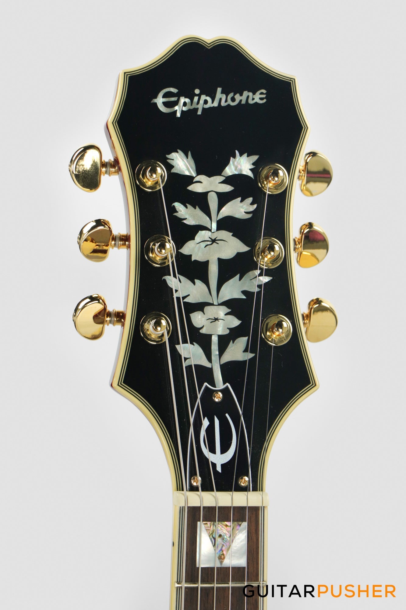 Hailed by blues legend John Lee Hooker as "an out-did 335," the Sheraton has been renown for decades for its combination of superior tone and beautiful pearloid and abalone inlay. Originally released in 1959, the inspiration for the "thin-line" or ES series has its roots in Les Paul's first solidbody guitar, "The Log," that Les built in Epiphone factory in Manhattan in 1940."The Log" was made from Epiphone parts with a 4" x 4" piece of Pinewood down the middle. The ES-series is also semi-hollow with a solid center, which makes it more resistant to feedback than a typical archtop guitar.