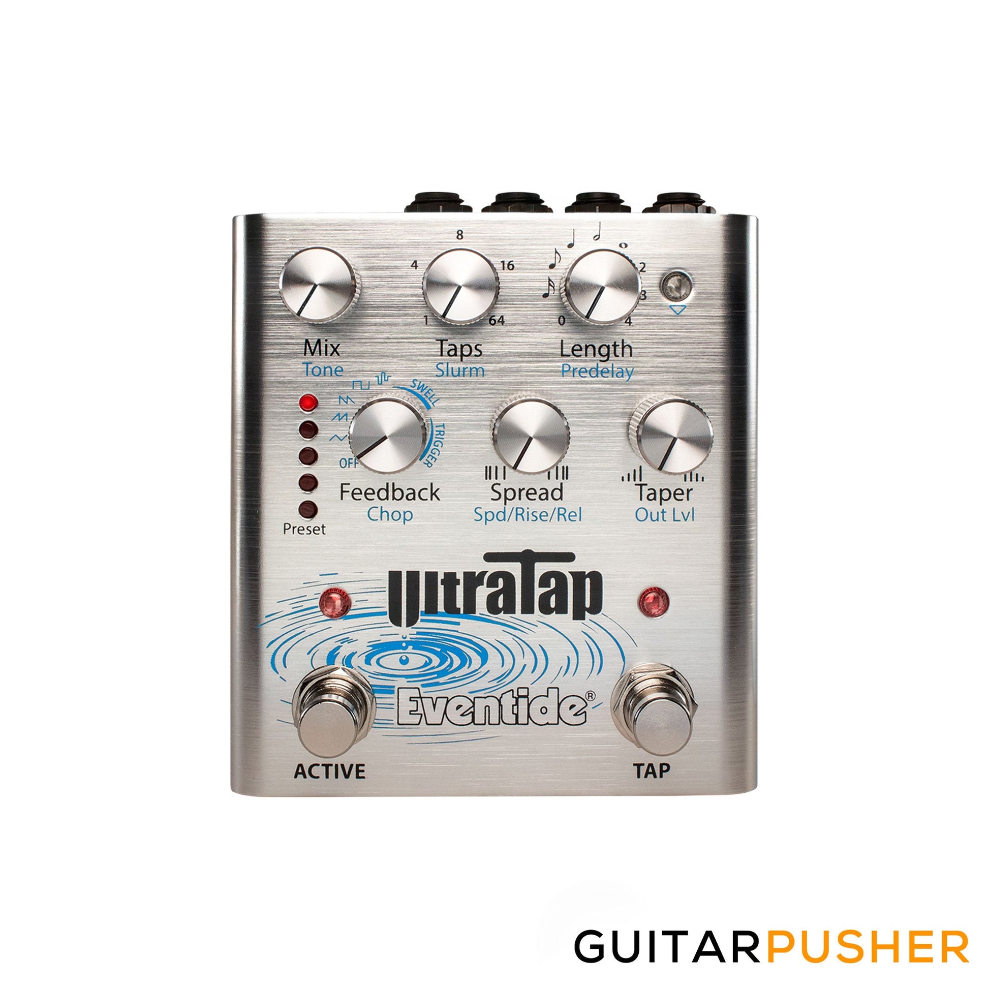 UltraTap’s controls make possible new and unexpected effects. The controls that you would expect in a multi-tap delay pedal — Number of Taps, Delay and Feedback — are just the basics. Controls for Spread, Slurm, and Chop open up a new world of possibilities.