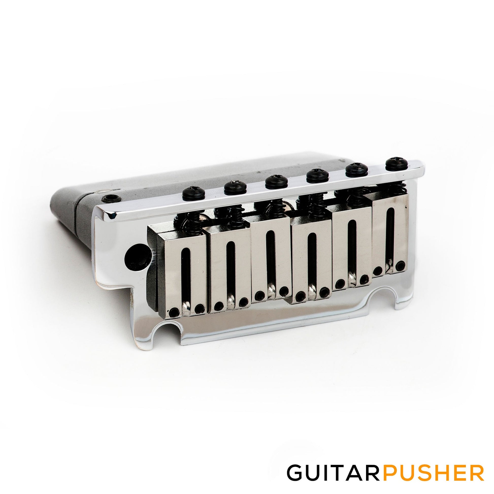 Chrome dual-pivot synchronized bridge assembly for use on American Deluxe and Ultra series Stratocaster® guitars manufactured from 1986-2010. Two-pivot synchronized bridge assembly with polished chrome block-style saddles, offset intonation screws, steel tremolo block, and pop-in tremolo arm. Modern-style narrow spacing.
