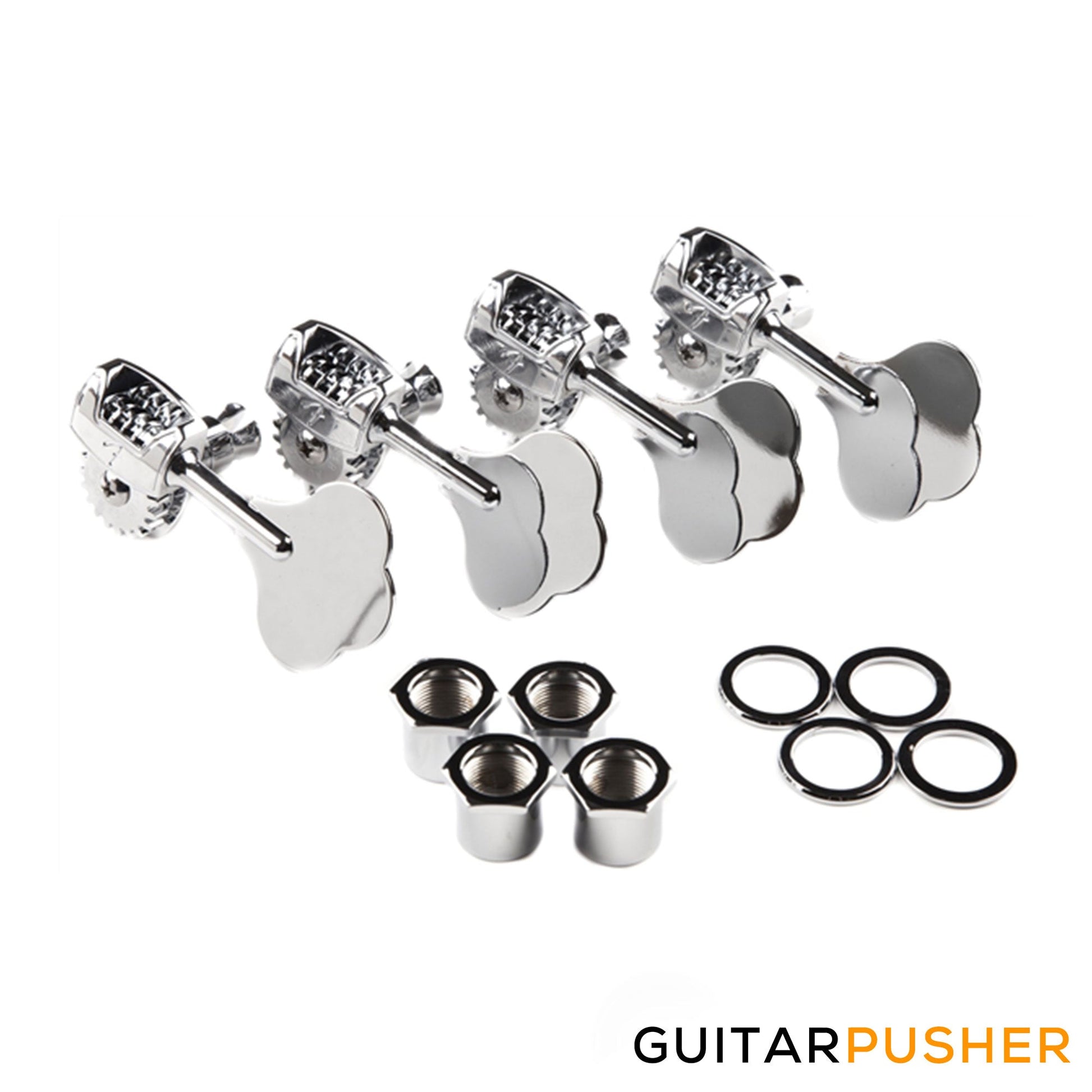 Set of four chrome tuning machines with Fender "F"-logo casing stamps, for use on modern Precision Bass®, Jazz Bass® and Dimension™ bass models, including American Standard basses manufactured from 2007-present and American Deluxe basses manufactured from 2009-present. Bushings and mounting hardware included.