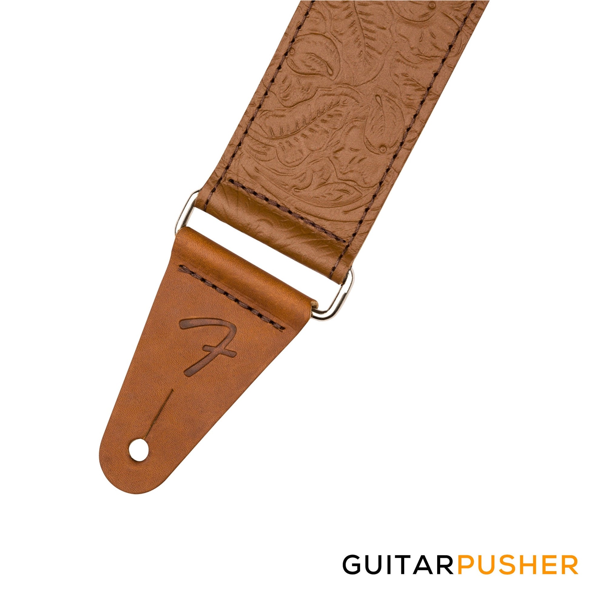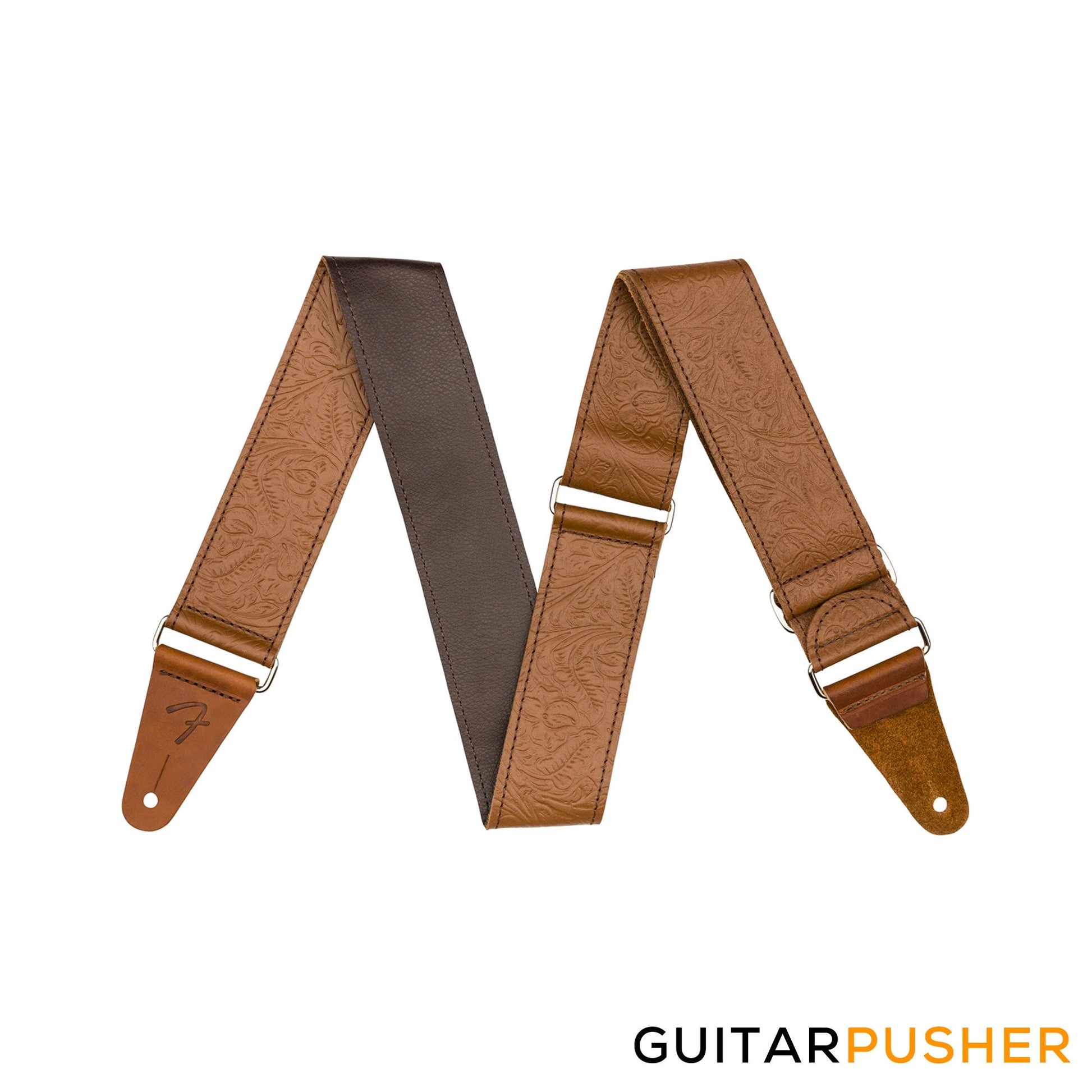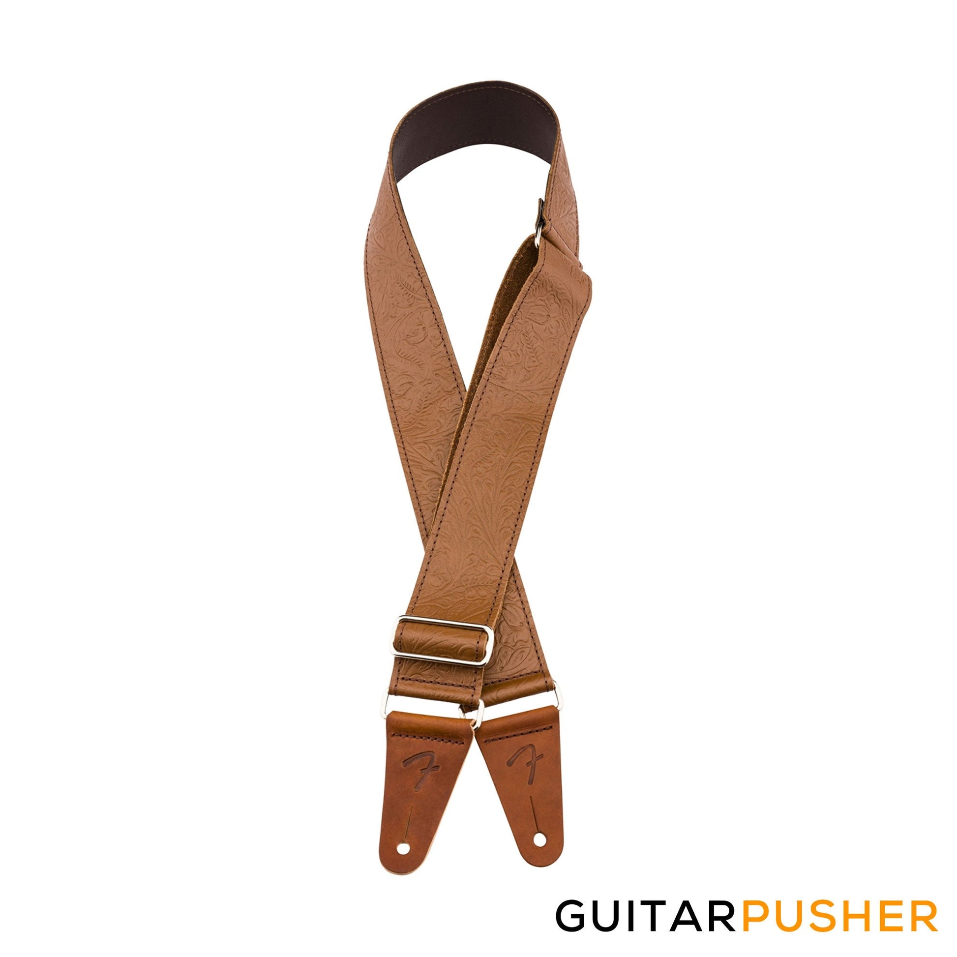 Inspired by the highly decorated straps favored by Western swing and country players, the Tooled Leather Strap brings classic style to any performance. Featuring an attractive floral pattern, this 2"-wide strap is designed for comfort, quality and aesthetics. The premium leather cone ends feature an embossed "F" logo to maintain the theme. The silver nickel slider allows the strap to adjust from 42"-52" in length to accommodate players of any stature.