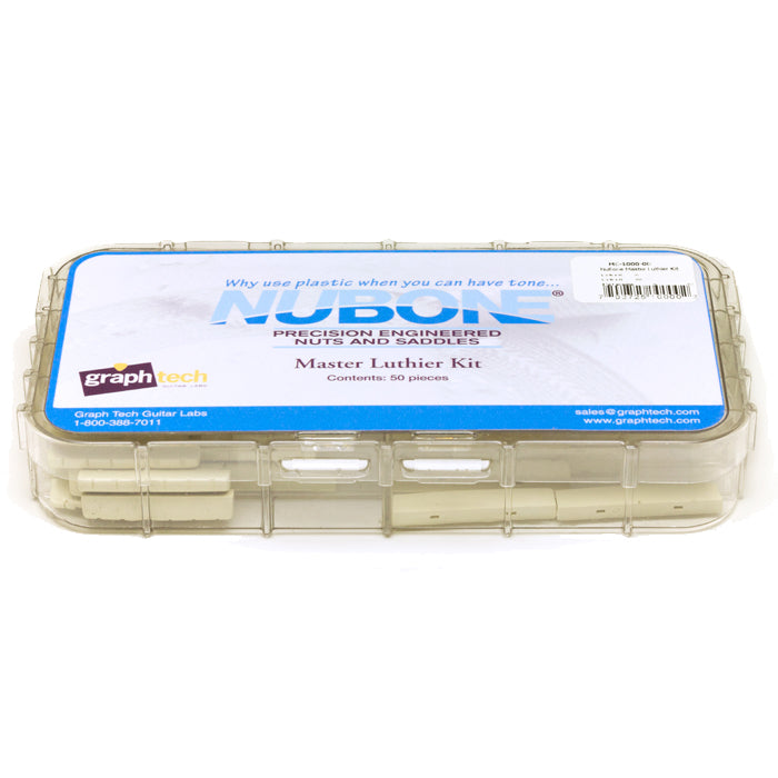 The MC-1000-00 is the perfect option to stock your music store or repair shop. It combines Graph Tech's nine most popular NuBone nuts and three most popular NuBone acoustic saddles for a total of 50 pieces. With this kit you can do repairs on more than 85% of guitars that will cross your work bench. The box is labeled with actual sized drawings and product codes of the nuts and saddles included making matching up what you have quick and easy. No store should be without. NuBone is a derivative of Graph Tech's highly resonant TUSQ material, manufactured to very close tolerances under high heat and pressure. We use specific ratios that contribute to NuBone's hardness, workability, appearance, and most importantly, guitar performance. Odorless when sanded, it is strong, outlasting and outperforming plastic. NuBone is the answer!
