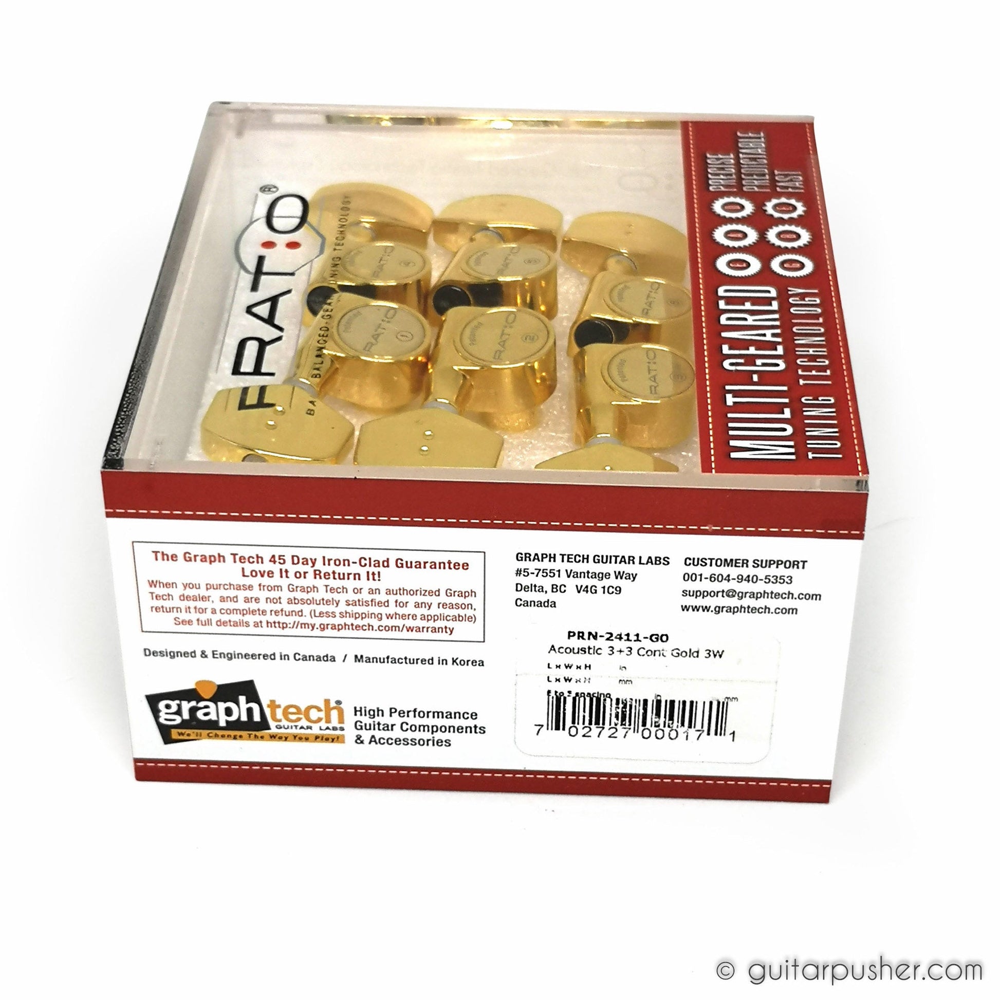ThePRN-2411-G0is a set of Ratio Tuned Machine Heads for an acoustic guitar that uses three a side tuners. It has a contemporary shaped button, has a two pin casing and is finished in gold.