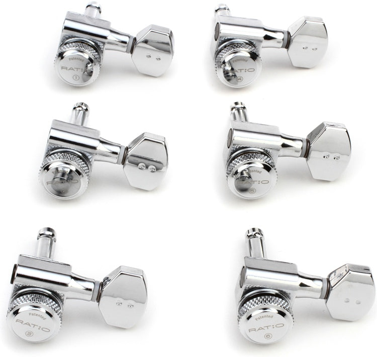 Ratio - Tuned Machine Heads are the first and only machine head to incorporate the different string gauges into the tuning equation. We balanced the individual gear ratios to each string dramatically simplified the tuning process. No more overshooting the G string or twisting away on the high E string. With Ratio, each half key turn equals one semitone change on all strings! Quicker, more accurate tuning on every string.