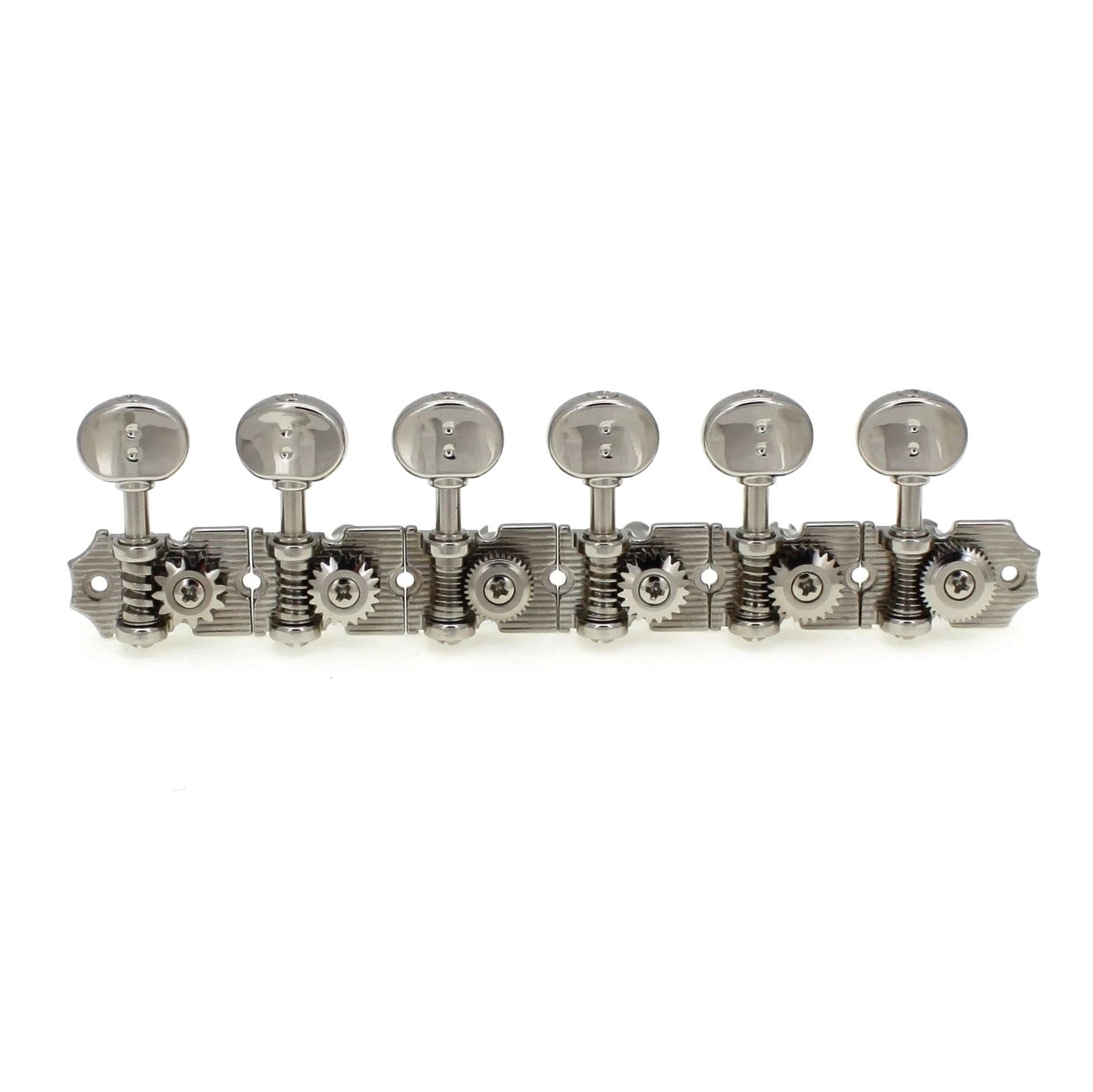 The PRN-4624-N0 is a right-handed set of Ratio Tuned Machine Heads in retro look for electric guitar that use 6-in-line side tuners. Open backs.