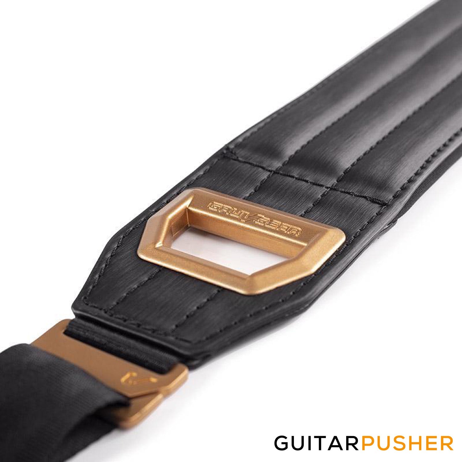 Introducing the new FABRK Strap Dekade Edition in a black and matte bronze color way to celebrate Gruv Gear’s 10th year anniversary.The exclusive guitar/bass strap features a beautiful brushed satin black top, classy matte bronze metal hardware and trim, vegan-friendly faux leather tips, and a generously-padded 3" (70mm) wide neoprene underside for unmatched comfort. Its smooth adjustable seatbelt webbing features a custom G-hook fastener to easily switch from standard to extra-long strap lengths.