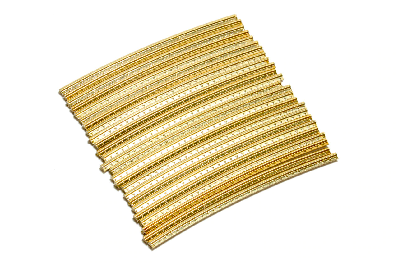 This premium JESCAR EVO Gold fret wire is absolutely beautiful, a perfect finishing touch for your special build or re-fretting job! It is gold all the way through, so it can be filed, crowned and otherwise dressed as much as necessary. It especially looks good on a darker fret board, so that the contrast is greater, but it also looks nice on lighter fret boards.