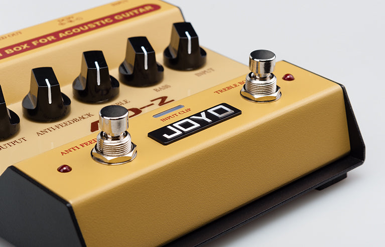 The AD-2 is an acoustic preamp and D.I. Box, it is designed for use with electro acoustic guitars or with electro ukulele. The JOYO AD-2 has a built-in dual band EQ so you can fine-tune the low and high frequencies. It also features a treble boost to push the high end when you need it. Another very helpful addition is the anti-feedback circuit, this is very useful for live performances.