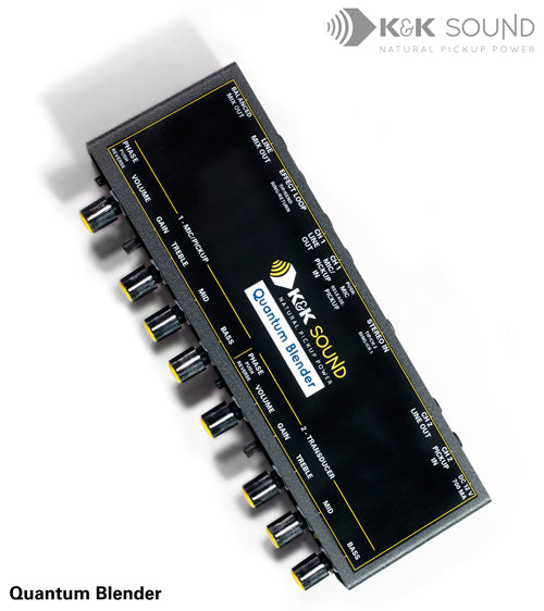 The Quantum Blender is our top-of-the-line two-channel preamp/mixer that provides all the control and features you could ever want to combine a piezo transducer with a microphone, magnetic pickup, or another piezo pickup.