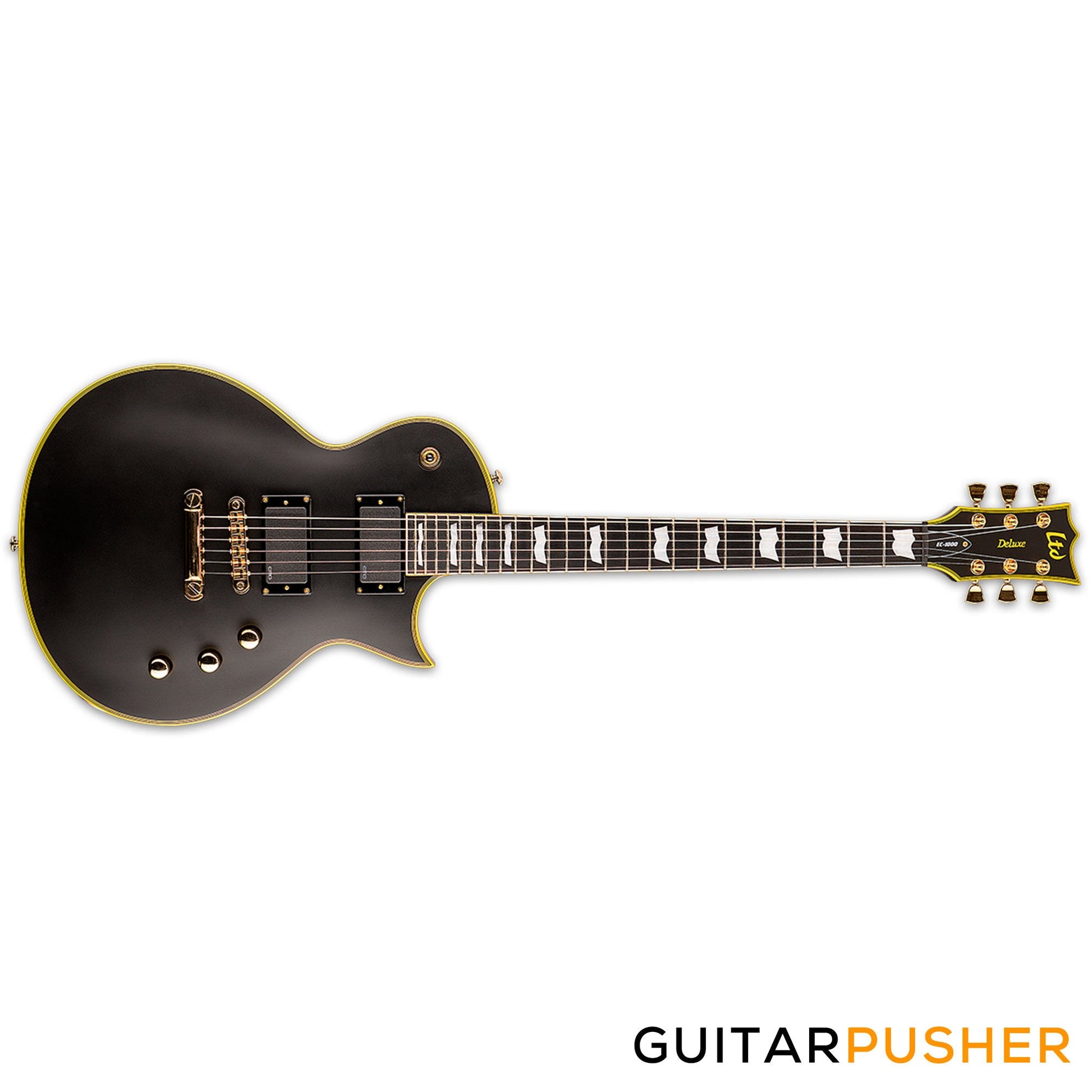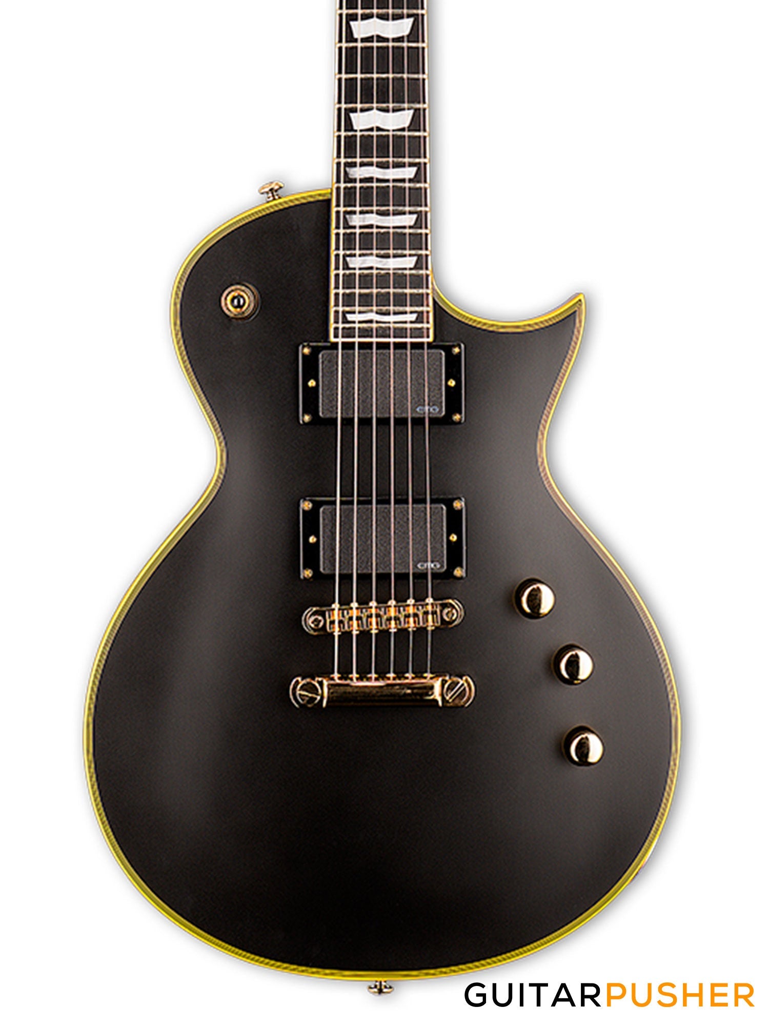 Guitars in the LTD EC-1000 Series are designed to offer the tone, feel, looks, and quality that working professional musicians need in an instrument, along with the pricing that typical musicians can still afford. The EC-1000 VB is consistently one of the most popular guitars due to its combination of incredible looks and great performance. It offers a vintage looking body/neck/headstock binding and gold hardware, and includes premier components like LTD locking tuners, a Tonepros locking TOM bridge and tailpiece, and the aggressive punch of active EMG 81/60 pickups. It also offers set-thru construction with a mahogany body, 3 pc. mahogany neck, and 24-fret Macassar ebony fingerboard. Available in Vintage Black finish.