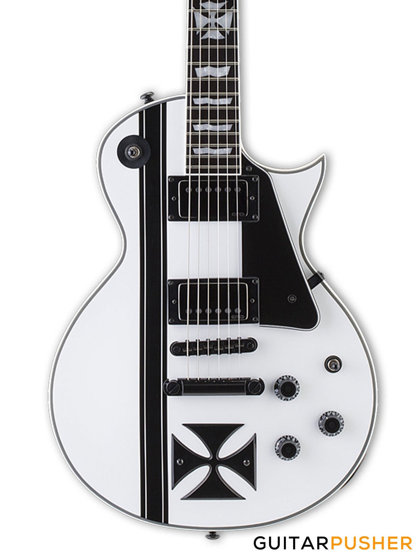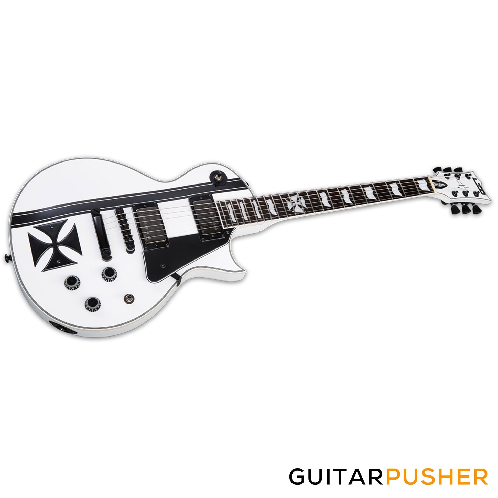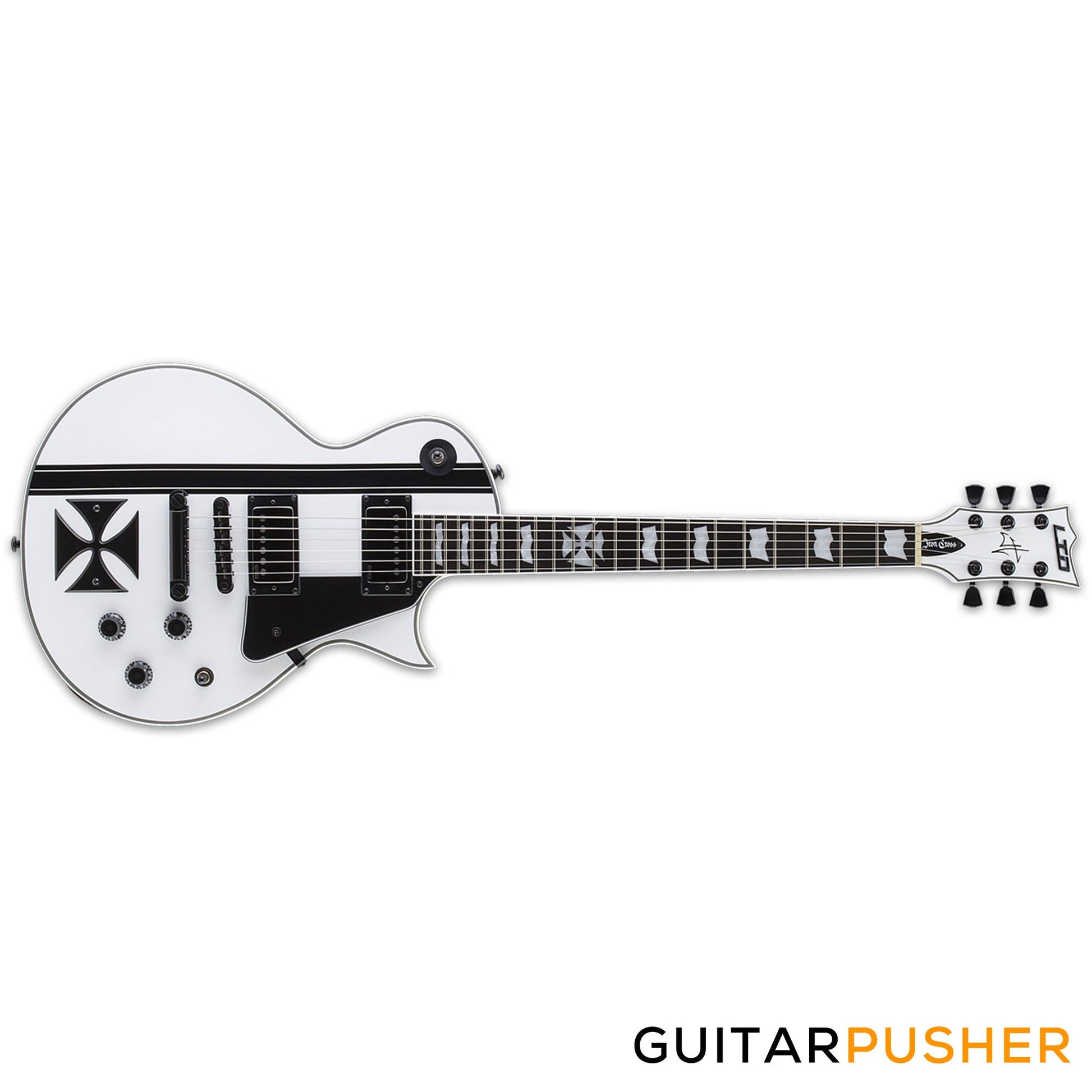 The LTD Iron Cross is a Signature Series model of James Hetfield, the frontman of Metallica and one of the world's most highly respected rhythm guitar players in any genre. The Iron Cross is based on James' personal custom instrument design, and features set-neck construction of a mahogany body with maple cap, and a three-piece mahogany neck with ebony fingerboard and 22 extra-jumbo frets with an Iron Cross inlay at the 12th fret. The LTD Iron Cross is powered by James' own EMG JH SET active pickups, and includes a TonePros locking TOM bridge and tailpiece. Available in Snow White finish with black stripe graphic and iron cross fixture.