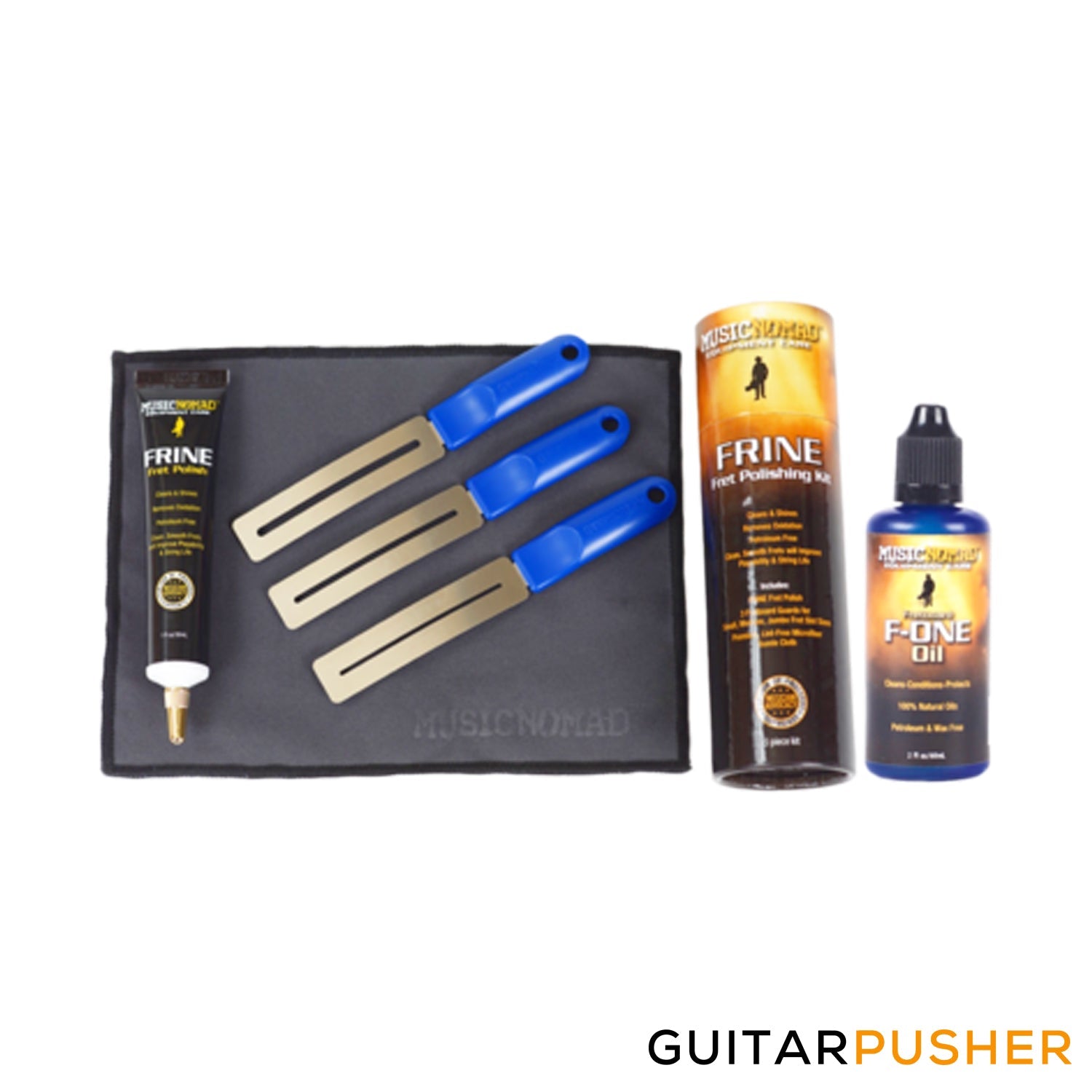 Music Nomad Total Fretboard Care Kit gives you all the products to restore, maintain and protect your frets and fretboard wood to give it that showroom look and feel. Start by using Music Nomad's FRINE fret polishing kit that will not only make bending and vibrato easier, but prolong your string life. Oxidized, dirty frets cause more string damage than you'd think. Music Nomad's FRINE fret polishing kit contains everything you need to give your frets an eye glaring, clean shine. The specially formulated FRINE fret polish has micro-fine polishing compounds that safely and quickly remove oxidation, dirt and oil. Music Nomad's innovative fretboard guards and premium microfiber cloth are designed to make it safe and super easy. The second step is to use Music Nomad's F-ONE that's formulated using a complex mixture of the finest ultra-refined oils to clean, condition, and protect your unfinished fretboard. This product is 100 percent free of any lemon extracts, waxes, petroleum distillates, detergents, and water. It leaves your fretboard looking new, playing great, and feeling smooth, never sticky or tacky. Developed using only naturally produced oils, F-ONE gives wood its life back. Look, Sound & Play the Best!