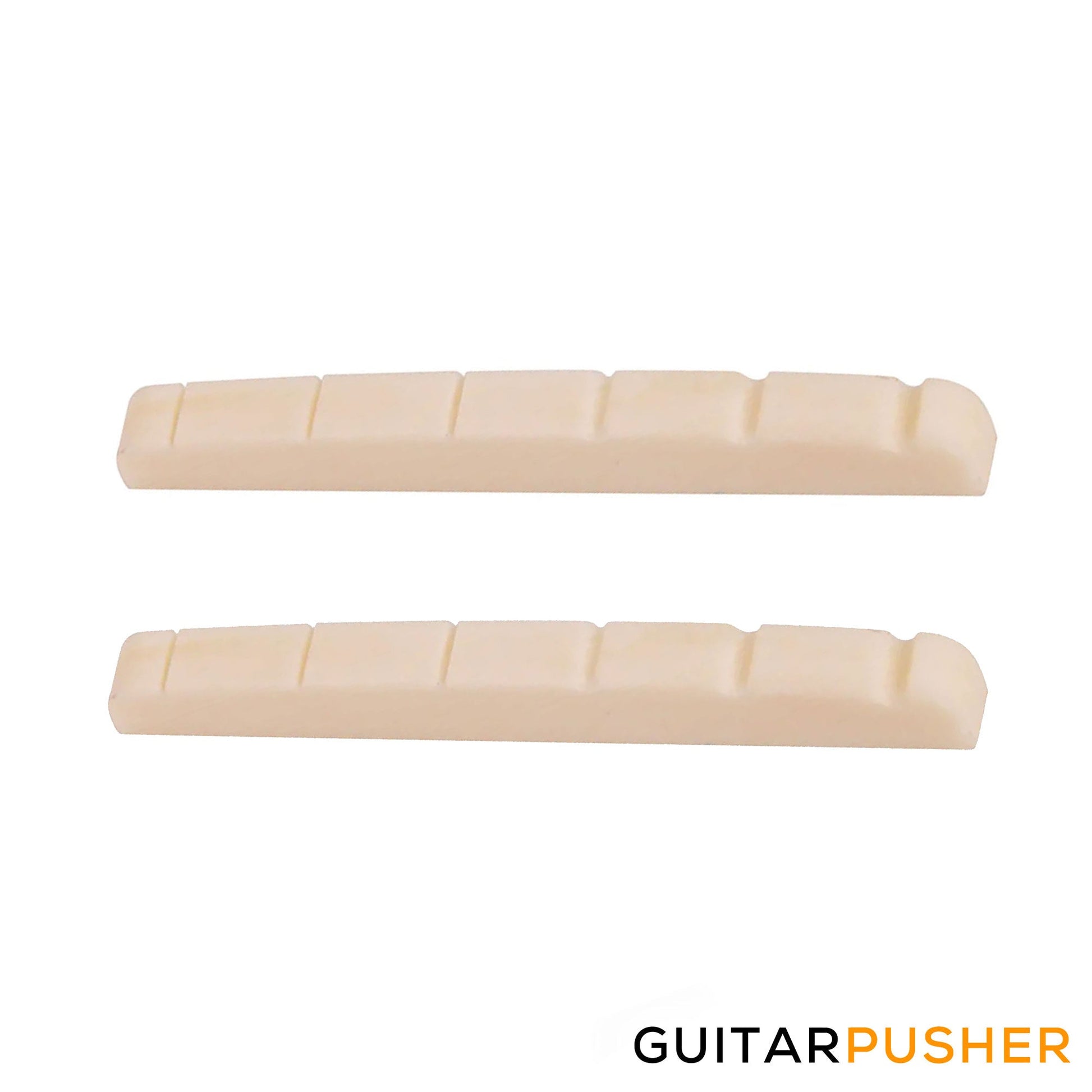 Slotted bone nut. Sold as a set of 2. Bone nuts are known for their premium tonal characteristics. They are hard and dense, yet lightweight, making them an excellent touchpoint for your guitar’s strings. Be sure to buy the appropriate nut for your neck shape.
