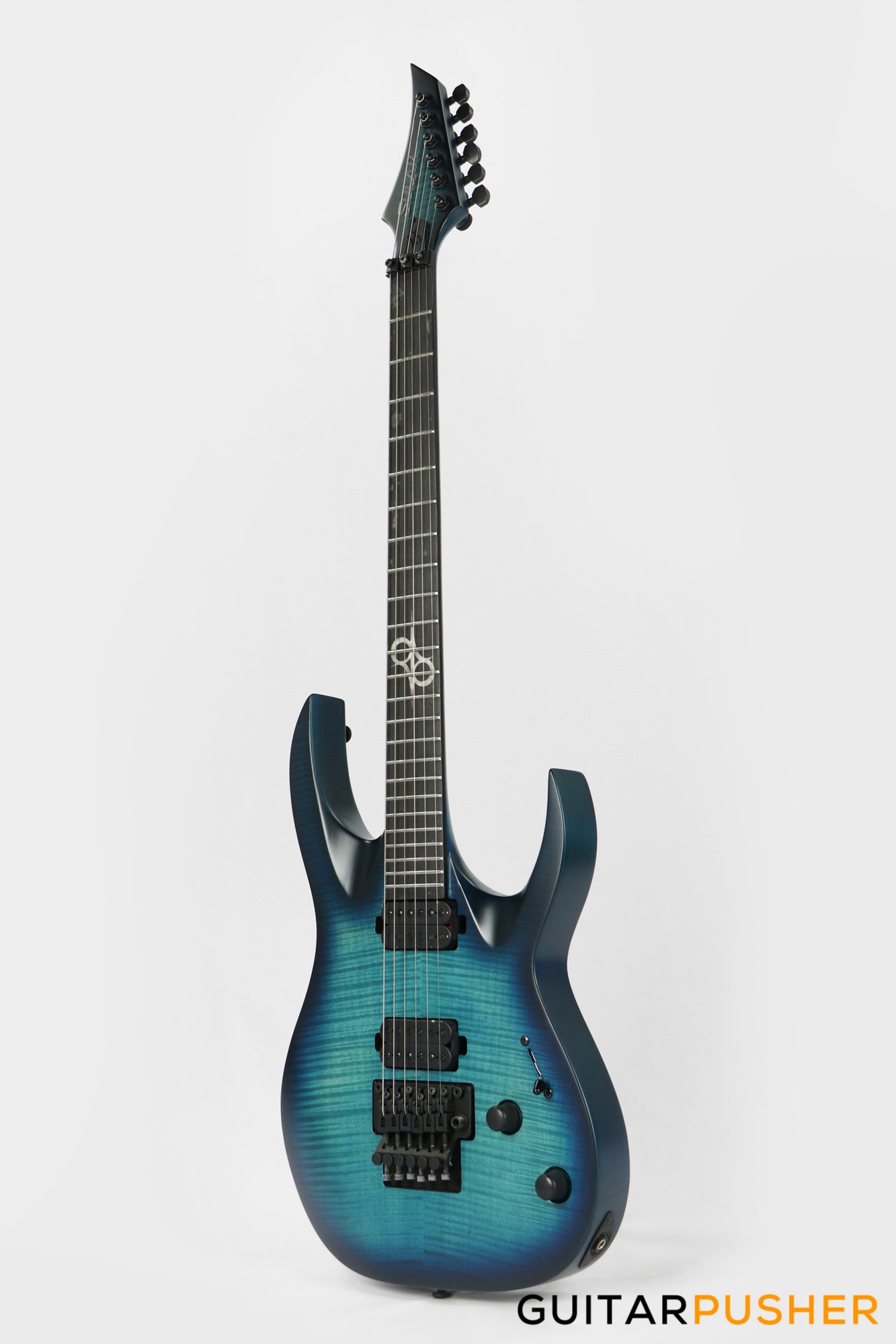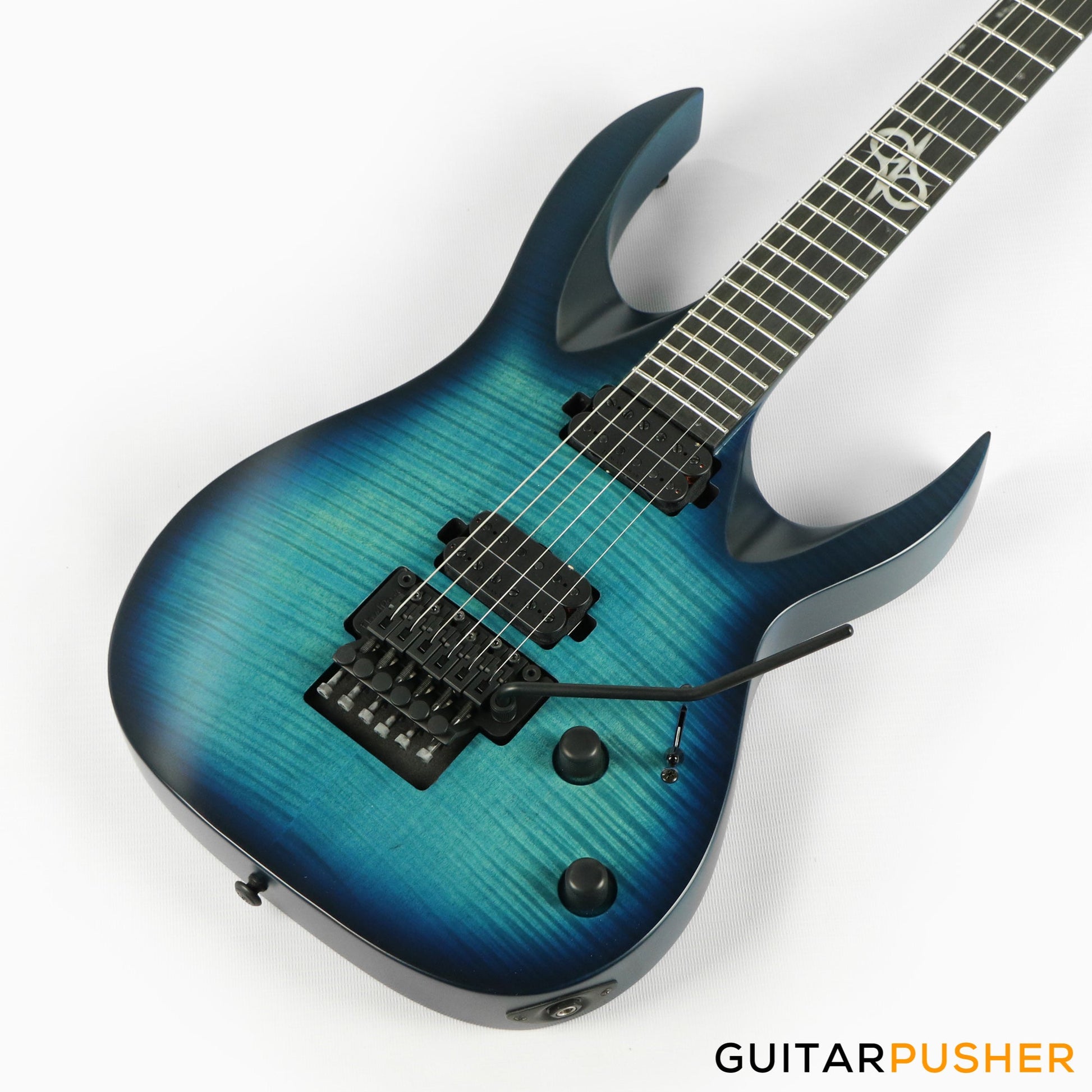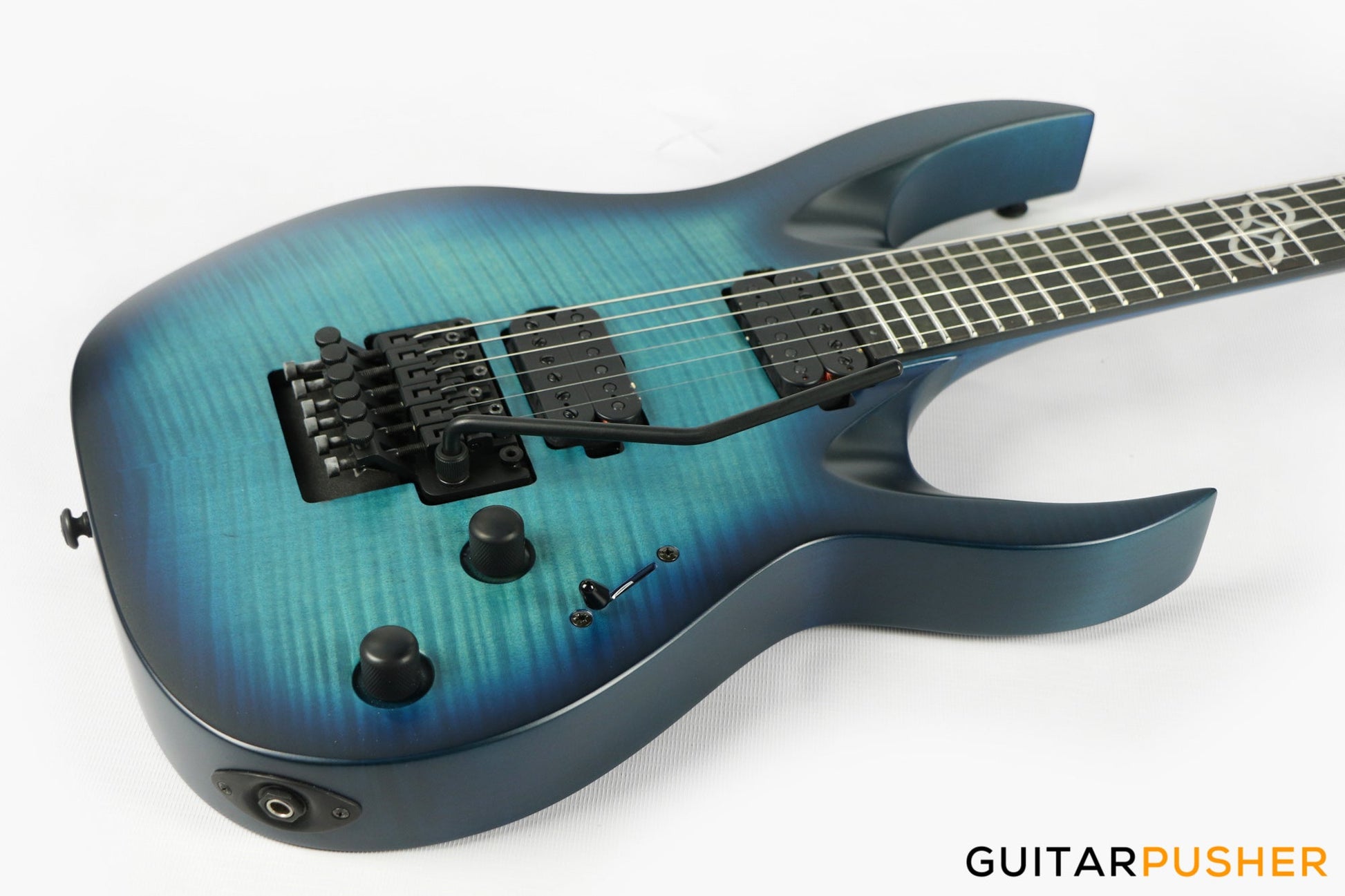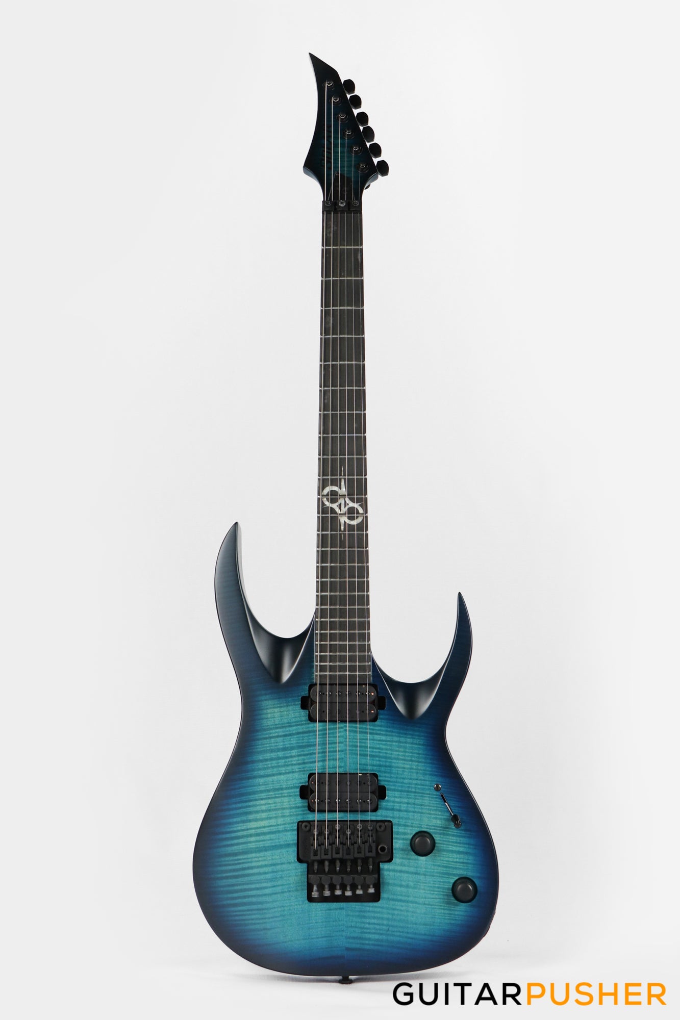 This Type A1.6FR six-string guitar boasts stealth looks, a distinctive cutaway scoop and a remarkable feature set, making it the ultimate, precise and professional instrument suitable for both stage and studio work. The reliable Floyd Rose 1000, made of hardened steel combined with an oversized block, offers increased sustain and resonance while all tremolo springs are mechanically muted. It also features Duncan Solar pickups that provide a full spectrum of tonal options, from organic clean to heavily overdriven, all with fluid sustain and maximum clarity.The Type A1.6 features a set-thru neck/body joint design with 25.5” scale, an alder body with flame maple veneer top, a fast, thin, comfortable maple neck, an ebony fingerboard with 24 super-jumbo stainless steel frets and Luminlay ‘glow in the dark’ side dots for easy stage use. Loaded with Solar 18:1 locking tuners, locking nut, five-way blade pickup switching and full access neck. Available in flame ocean blue matte finish.