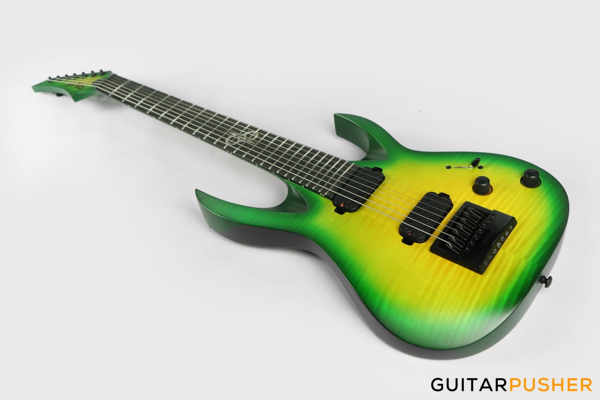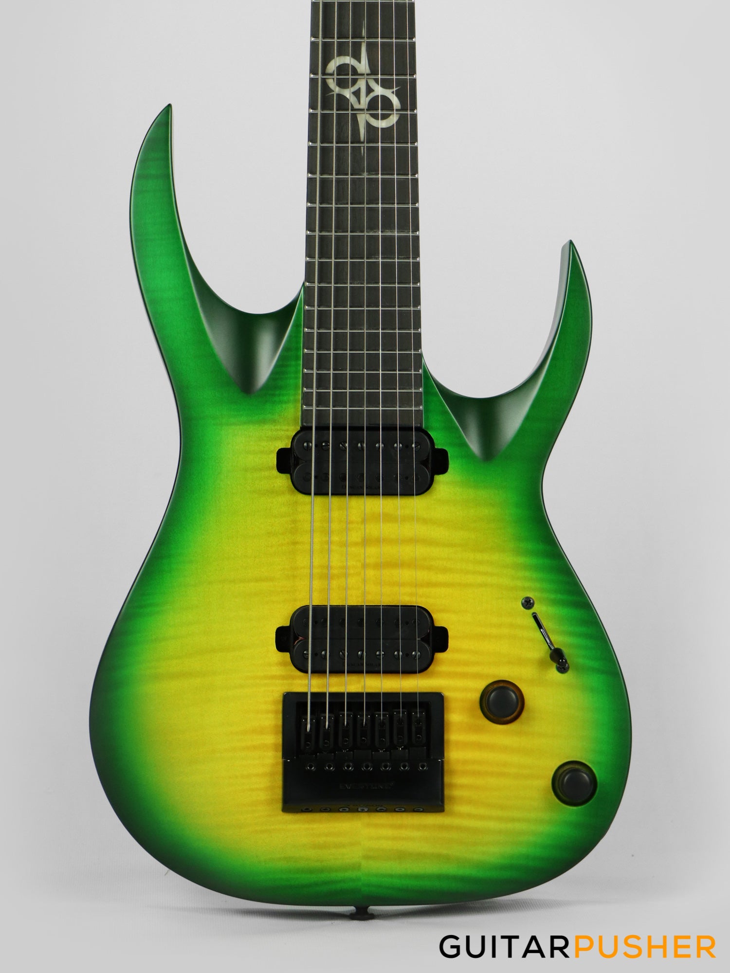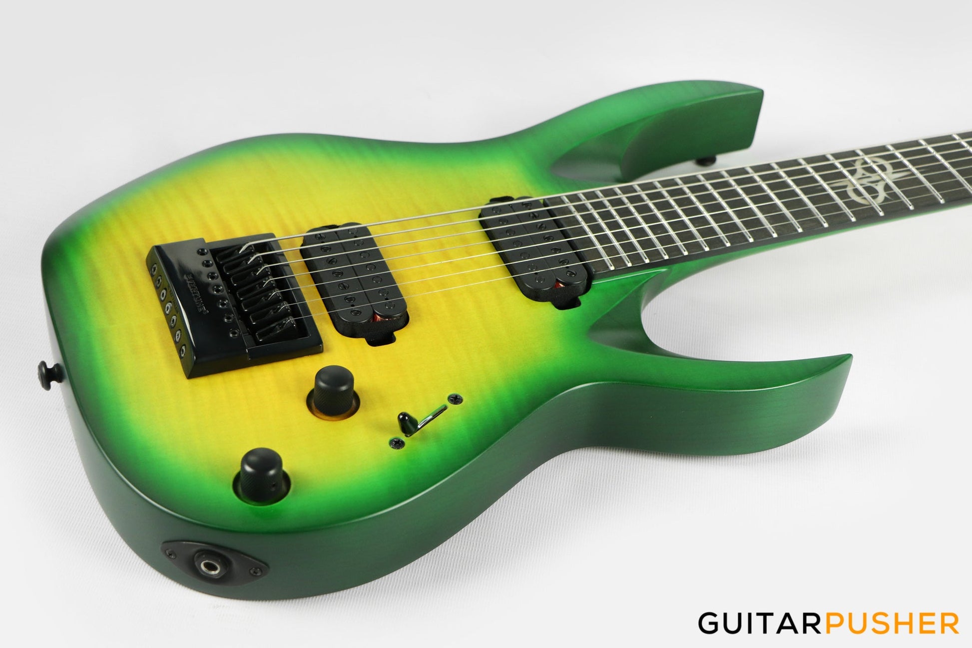 This Type A1.7 seven-string guitar boasts stealth looks, a distinctive cutaway scoop and a remarkable feature set, making it the ultimate, precise and professional instrument suitable for both stage and studio work. This guitar features the Evertune® constant-tension bridge—a reliable, fully-mechanical system that keeps the guitar in tune under any circumstances. It also features Duncan Solar pickups that provide a full spectrum of tonal options, from organic clean to heavily overdriven, all with fluid sustain and maximum clarity. The Type A1.7 features a set-thru neck/body joint design with 26.5” scale, an alder body with flame maple veneer top, a fast, thin, comfortable maple neck, an ebony fingerboard with 24 stainless steel super-jumbo frets and luminlay ‘glow in the dark’ side dots for easy stage use. Loaded with Solar 18:1 locking tuners, graphite nut, five-way blade pickup switching and full access neck. Available in flame lime burst matte finish.