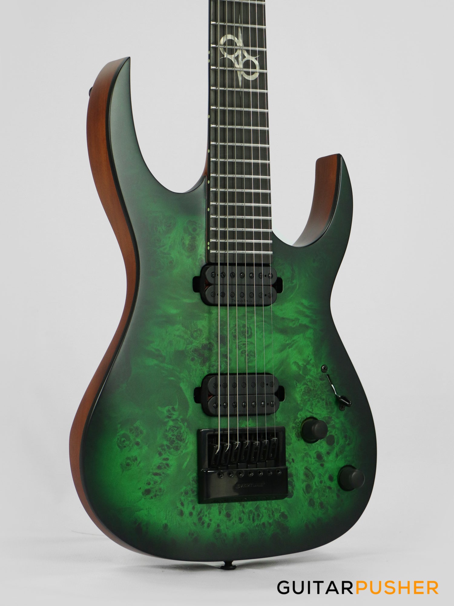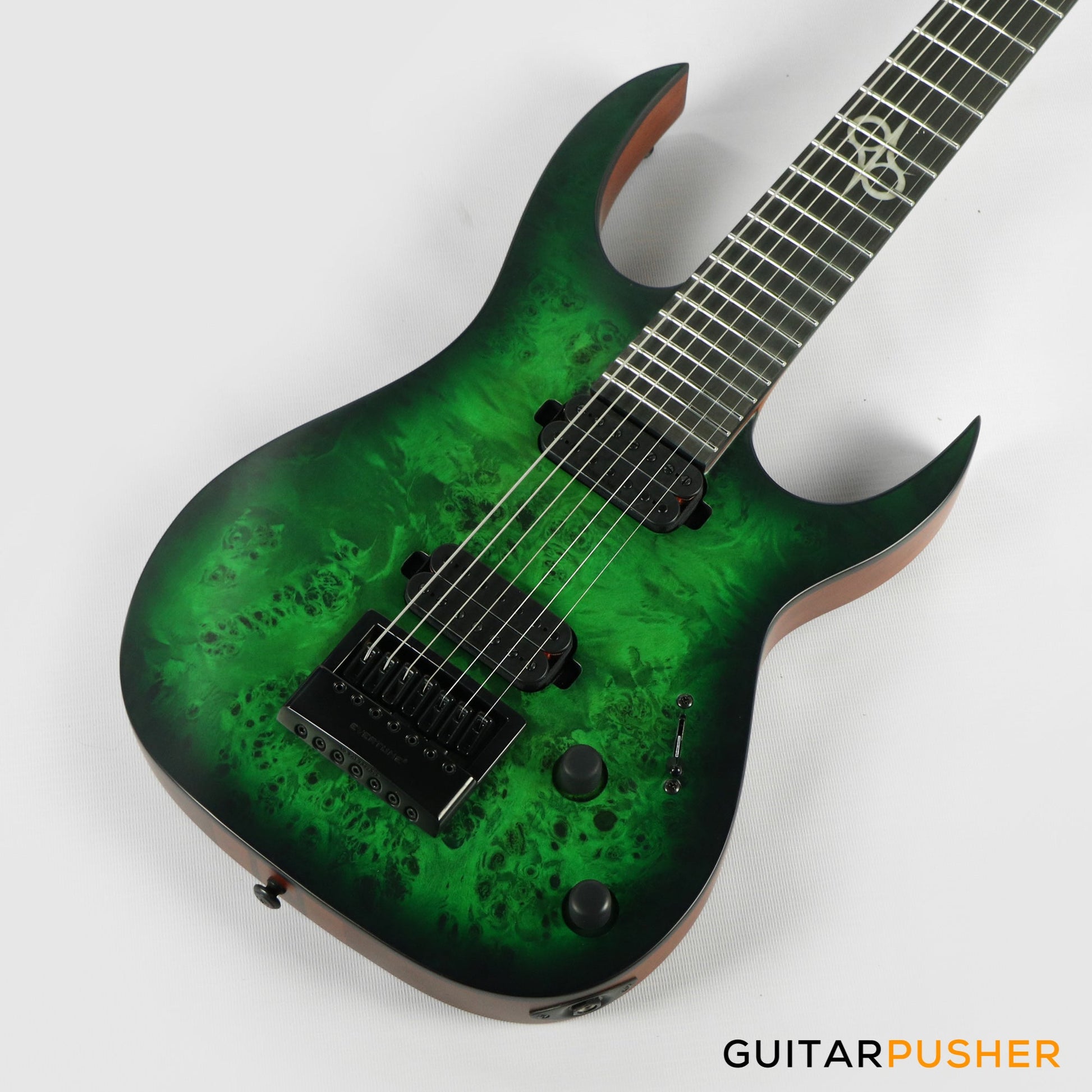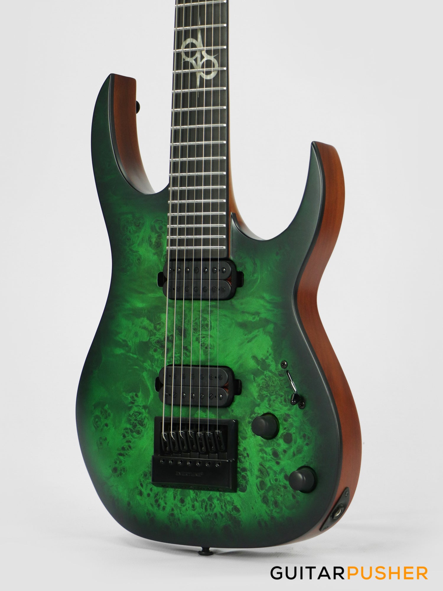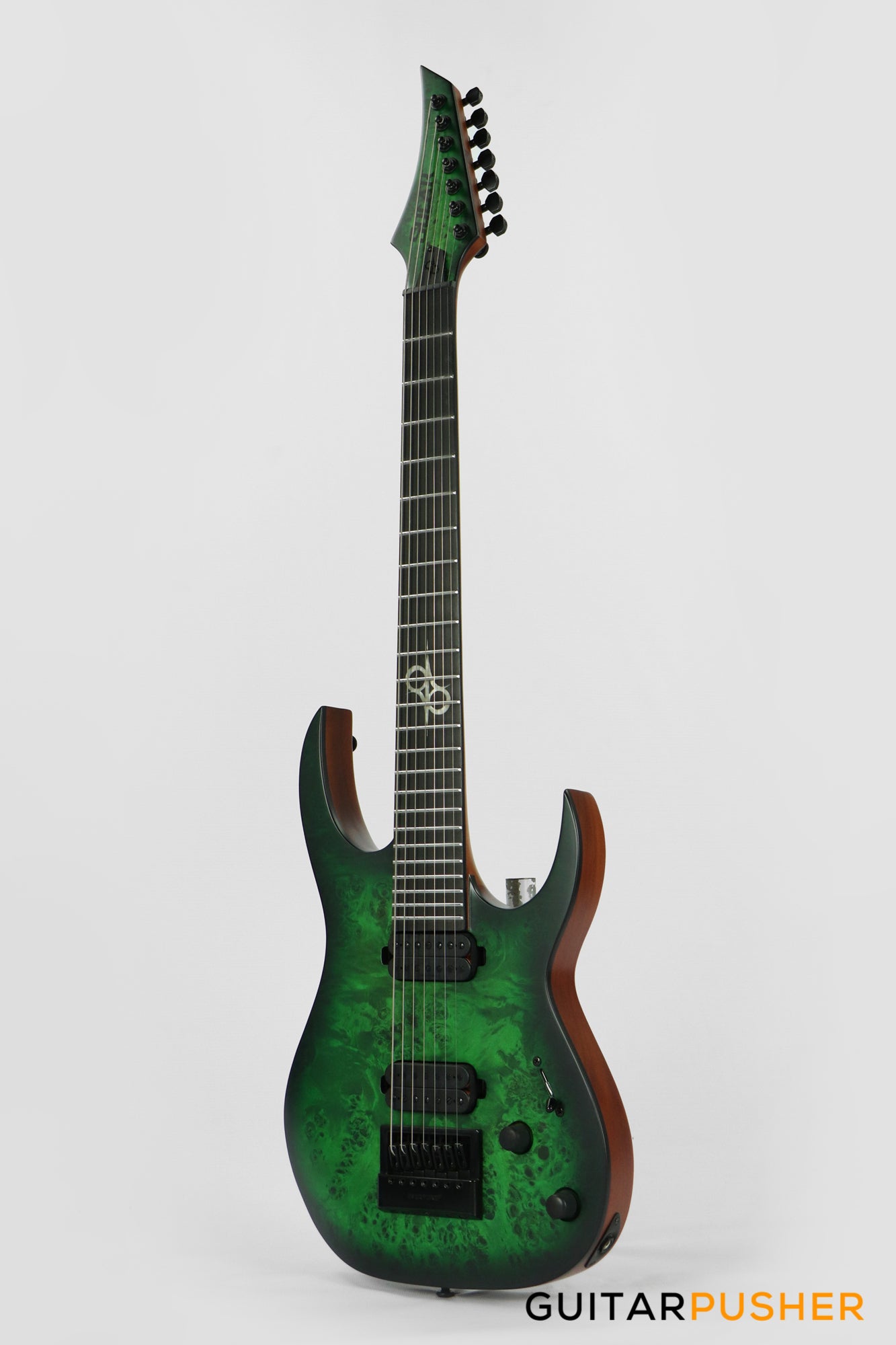 This Type S1.7 7-string Poplar Burl guitar combines our dedicated craftsmanship, skill and care for detail with a remarkable feature set, making it the ultimate, precise and professional instrument suitable for both stage and studio work. The S1.7 features the Evertune® constant-tension bridge—a reliable, fully-mechanical system that keeps the guitar in tune under any circumstances. It is loaded with Duncan Solar pickups that provide a full spectrum of tonal options, from organic clean to heavily overdriven, all with fluid sustain and maximum clarity. This Type S1.7 guitar has a neck-through construction with 26.5” scale, a poplar burl veneer over mahogany body with black binding, a fast C-shaped thin 5-ply maple/jatoba neck, an ebony fingerboard with 24 super-jumbo stainless steel frets and Luminlay ‘glow in the dark’ side dots for easy stage use. It comes loaded with Solar 18:1 locking tuners, graphite nut, five-way blade pickup switching and full access neck. Available in lime burst matte finish.