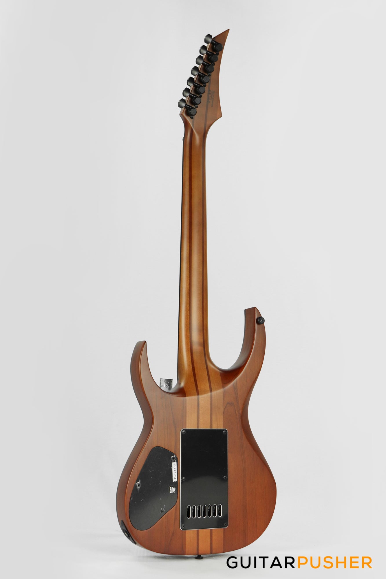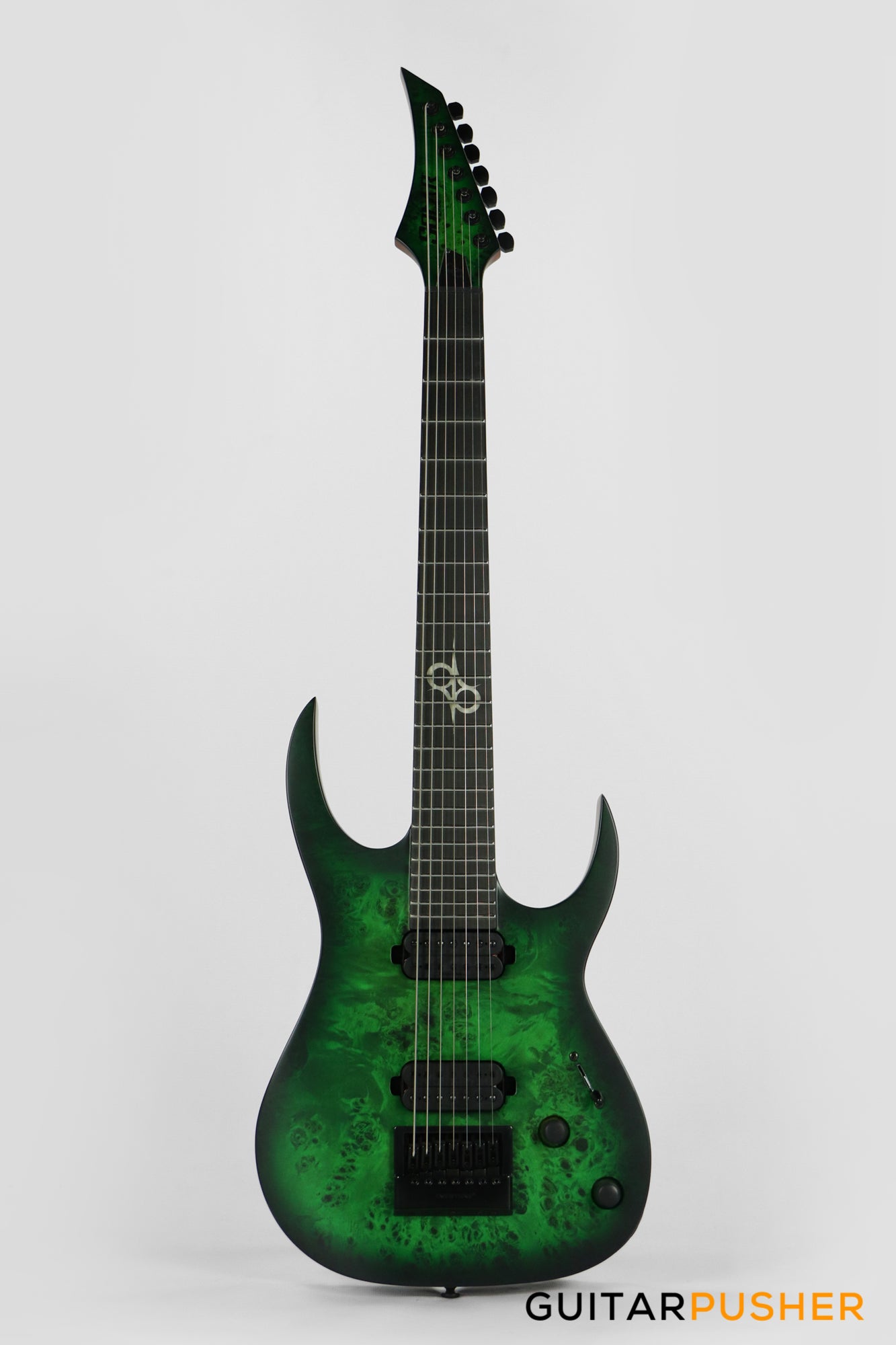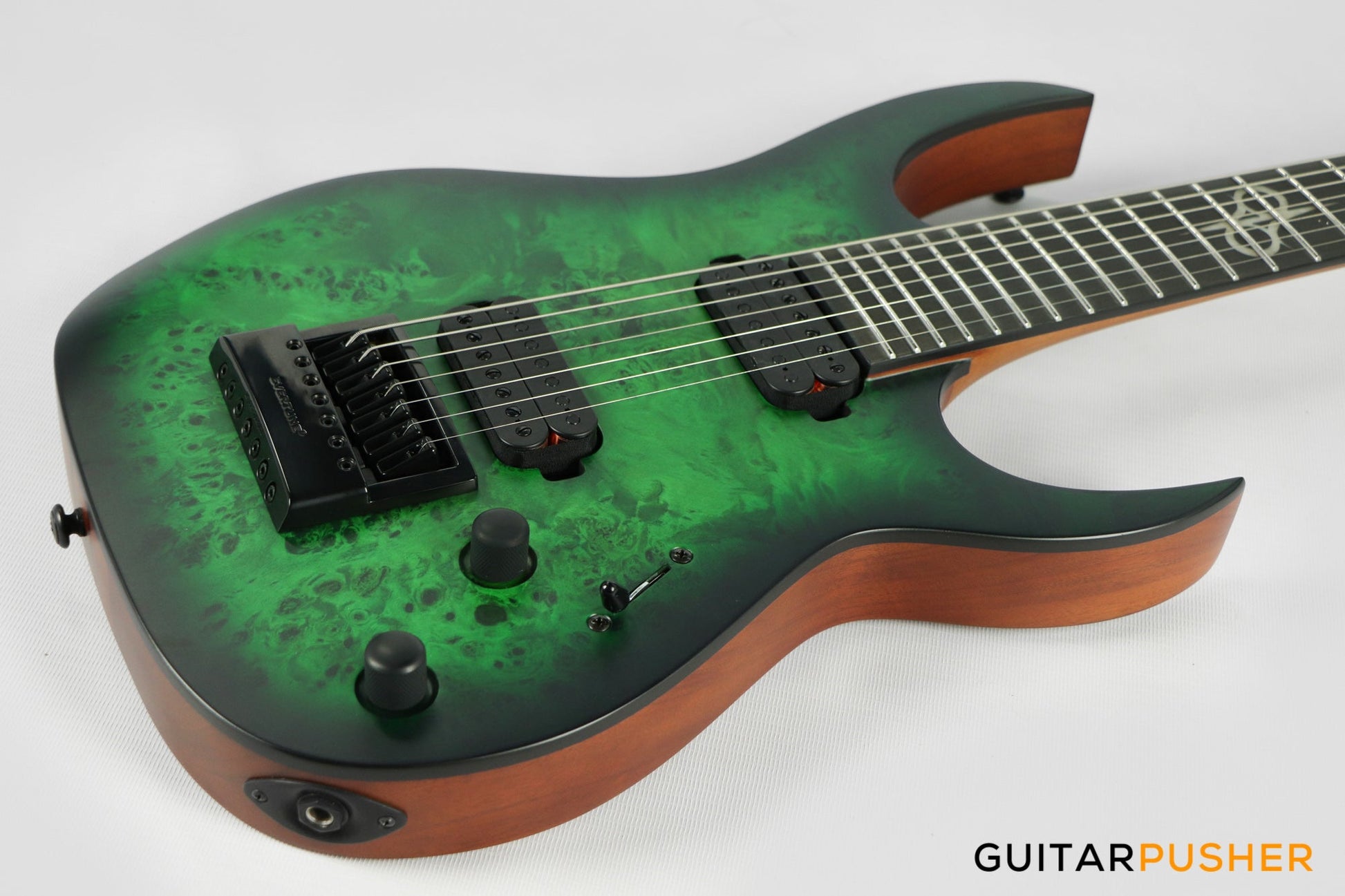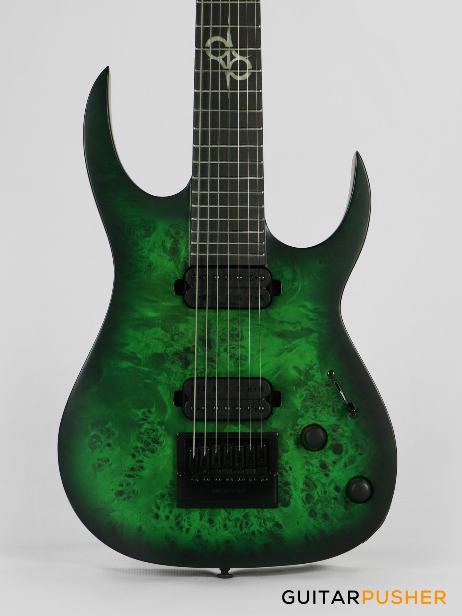 This Type S1.7 7-string Poplar Burl guitar combines our dedicated craftsmanship, skill and care for detail with a remarkable feature set, making it the ultimate, precise and professional instrument suitable for both stage and studio work. The S1.7 features the Evertune® constant-tension bridge—a reliable, fully-mechanical system that keeps the guitar in tune under any circumstances. It is loaded with Duncan Solar pickups that provide a full spectrum of tonal options, from organic clean to heavily overdriven, all with fluid sustain and maximum clarity. This Type S1.7 guitar has a neck-through construction with 26.5” scale, a poplar burl veneer over mahogany body with black binding, a fast C-shaped thin 5-ply maple/jatoba neck, an ebony fingerboard with 24 super-jumbo stainless steel frets and Luminlay ‘glow in the dark’ side dots for easy stage use. It comes loaded with Solar 18:1 locking tuners, graphite nut, five-way blade pickup switching and full access neck. Available in lime burst matte finish.