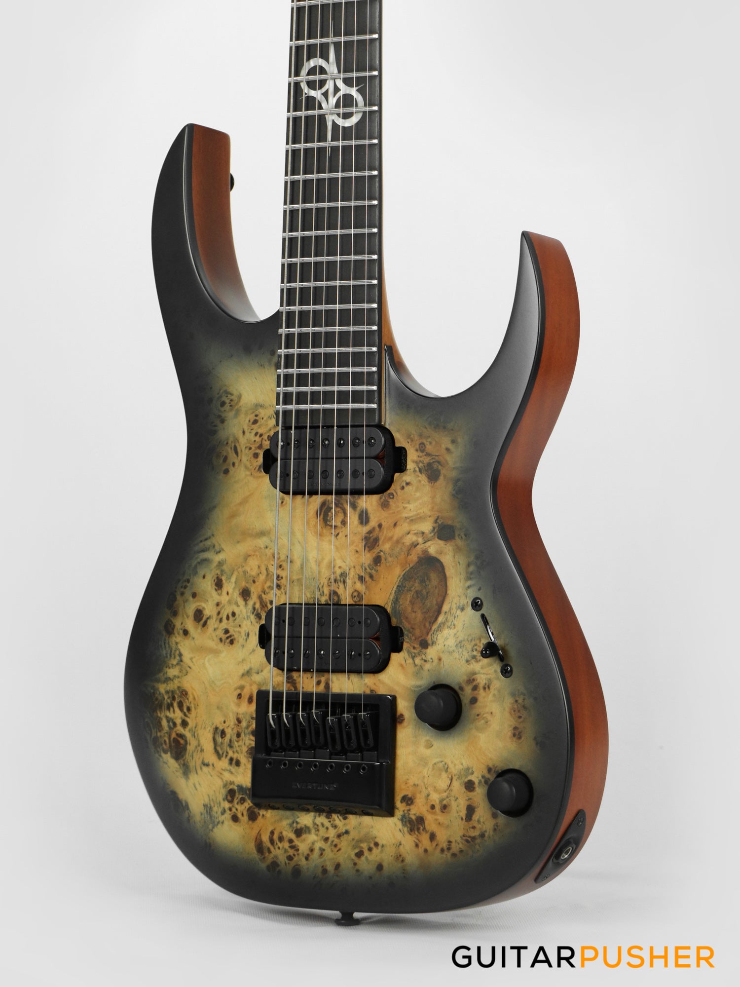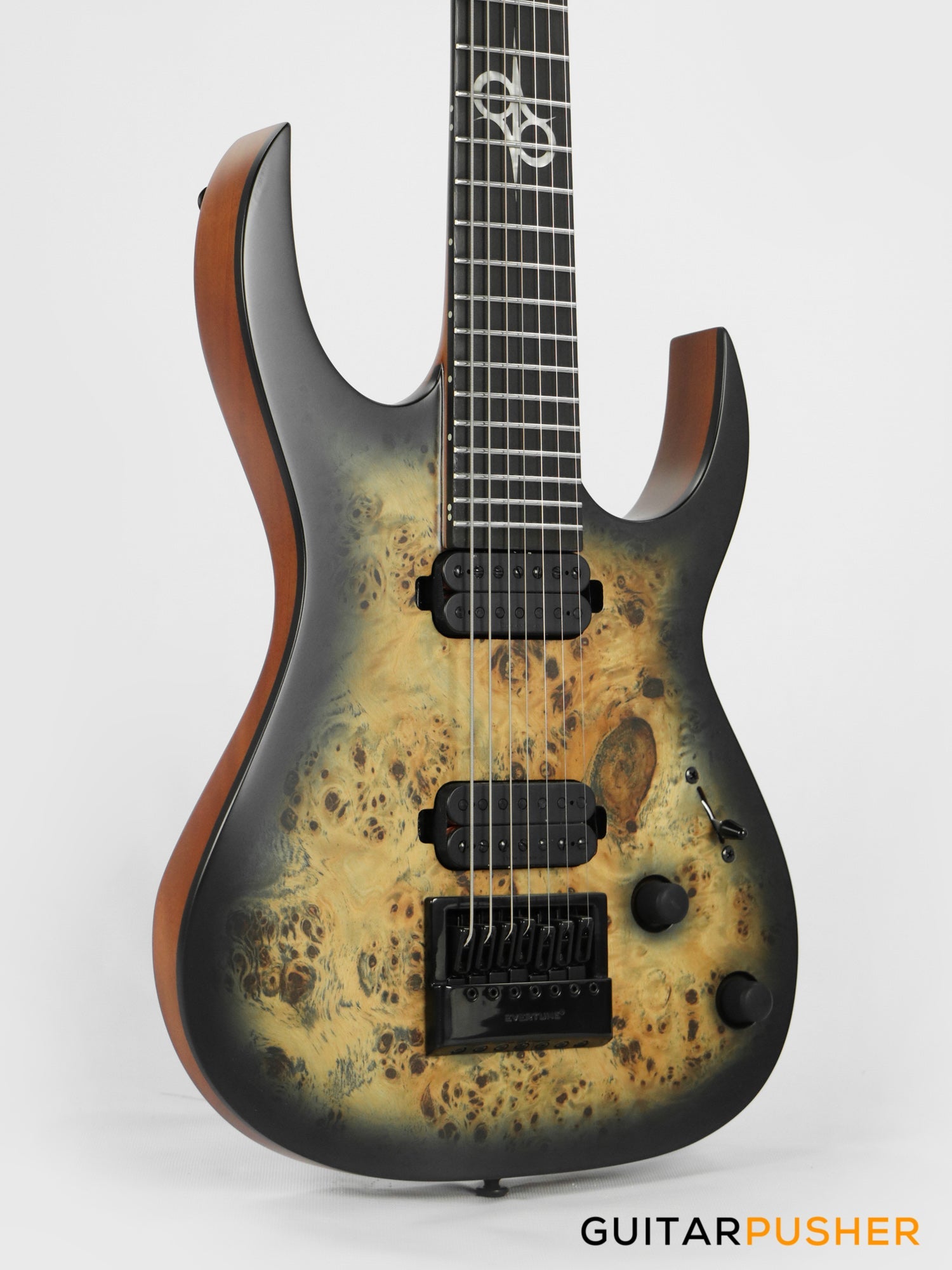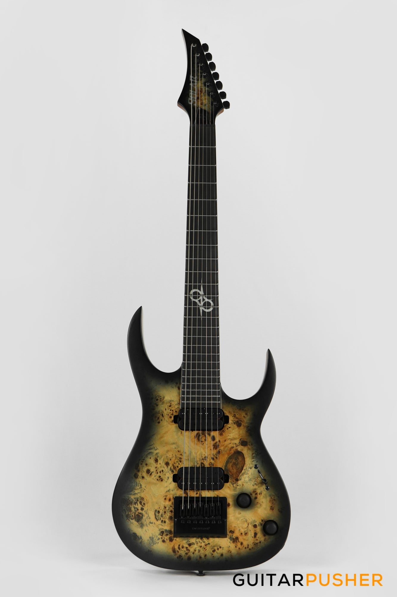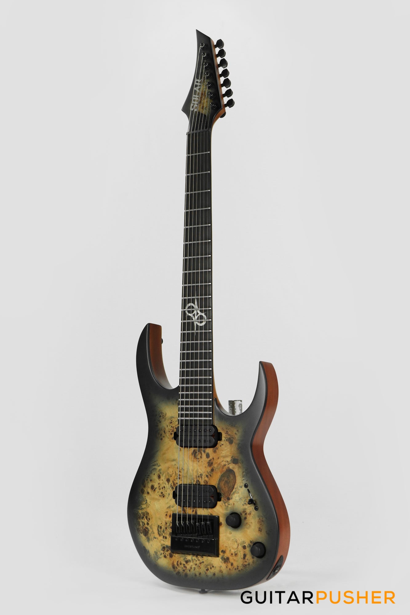 This Type S1.7 7-string Poplar Burl guitar combines our dedicated craftsmanship, skill and care for detail with a remarkable feature set, making it the ultimate, precise and professional instrument suitable for both stage and studio work. The S1.7PB features the Evertune® constant-tension bridge—a reliable, fully-mechanical system that keeps the guitar in tune under any circumstances. It is loaded with Duncan Solar pickups that provide a full spectrum of tonal options, from organic clean to heavily overdriven, all with fluid sustain and maximum clarity. This Type S1.7PB guitar has a neck-through construction with 26.5” scale, a poplar burl veneer over mahogany body with black binding, a fast C-shaped thin 5-ply maple/jatoba neck, an ebony fingerboard with 24 super-jumbo stainless steel frets and Luminlay ‘glow in the dark’ side dots for easy stage use. It comes loaded with Solar 18:1 locking tuners, graphite nut, five-way blade pickup switching and full access neck. Available in poplar burst matte finish.