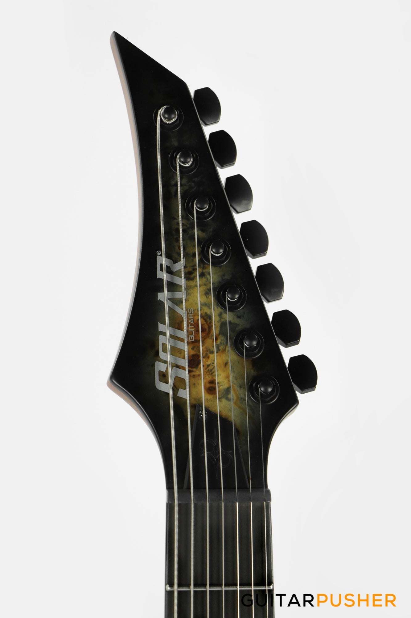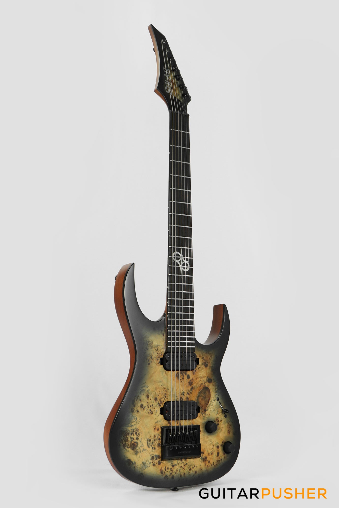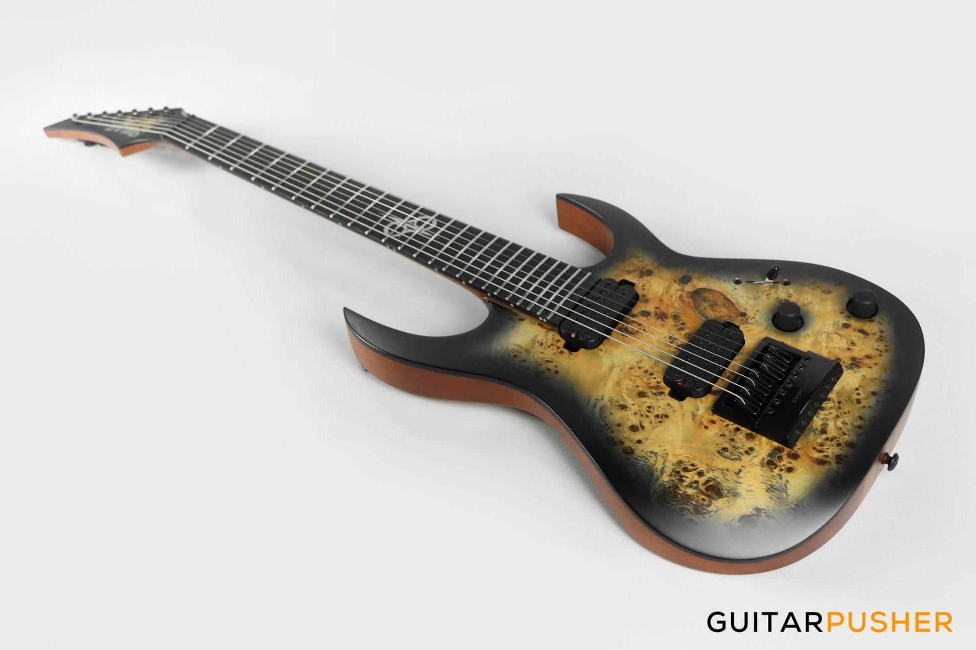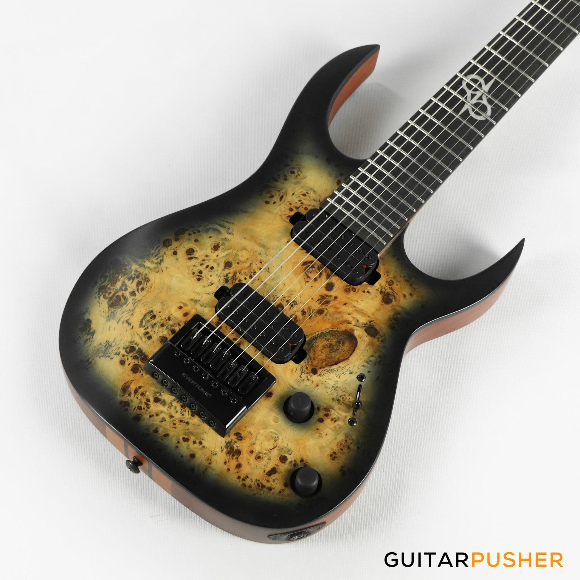 This Type S1.7 7-string Poplar Burl guitar combines our dedicated craftsmanship, skill and care for detail with a remarkable feature set, making it the ultimate, precise and professional instrument suitable for both stage and studio work. The S1.7PB features the Evertune® constant-tension bridge—a reliable, fully-mechanical system that keeps the guitar in tune under any circumstances. It is loaded with Duncan Solar pickups that provide a full spectrum of tonal options, from organic clean to heavily overdriven, all with fluid sustain and maximum clarity. This Type S1.7PB guitar has a neck-through construction with 26.5” scale, a poplar burl veneer over mahogany body with black binding, a fast C-shaped thin 5-ply maple/jatoba neck, an ebony fingerboard with 24 super-jumbo stainless steel frets and Luminlay ‘glow in the dark’ side dots for easy stage use. It comes loaded with Solar 18:1 locking tuners, graphite nut, five-way blade pickup switching and full access neck. Available in poplar burst matte finish.
