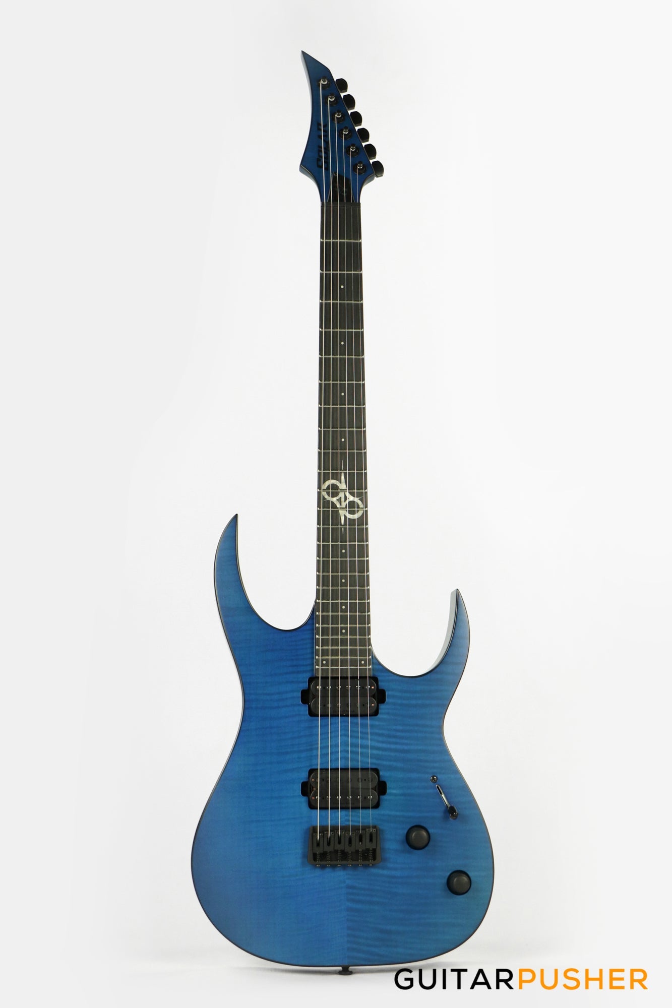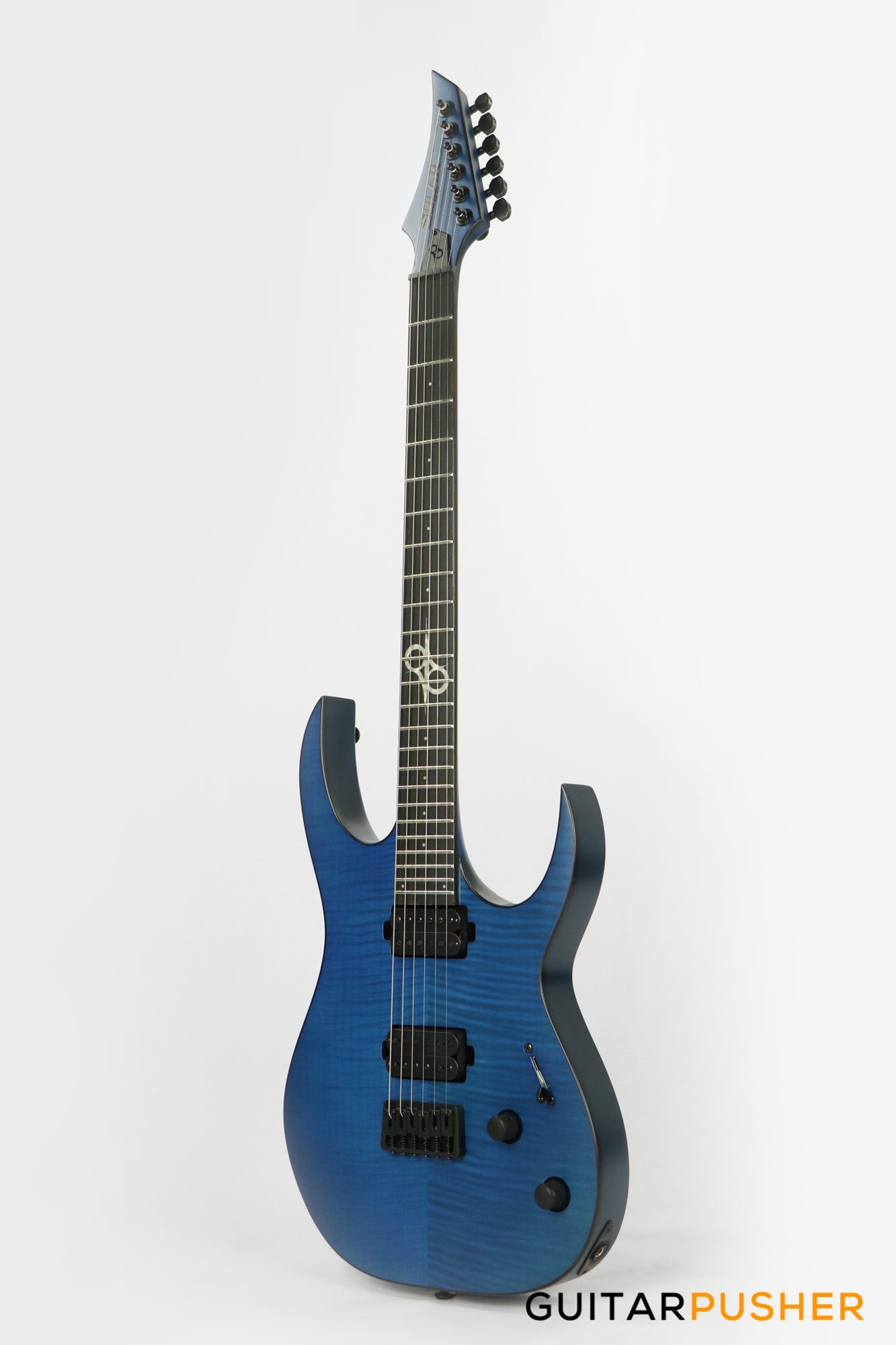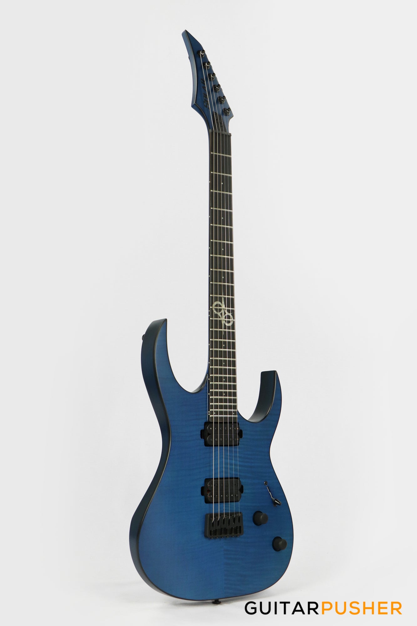 This Type S2.6 guitar combines our dedicated craftsmanship, skill and care for detail with a feature set, making it a precise, professional instrument suitable for both stage and studio work. It is loaded with a reliable string-through-body hardtail bridge and Duncan Solar pickups that provide a full spectrum of tonal options, from organic clean to heavily overdriven, all with fluid sustain and maximum clarity. The Type S2.6 guitar features a set-thru neck/body joint design with 25.5” scale, a mahogany body with flame maple veneer top and black binding, a fast, thin, comfortable maple neck and ebony fingerboard with 24 super-jumbo frets. Also included are Solar 18:1 tuners, graphite nut, black matte hardware, five-way blade pickup switching and full access neck. Available in flame blue matte finish.