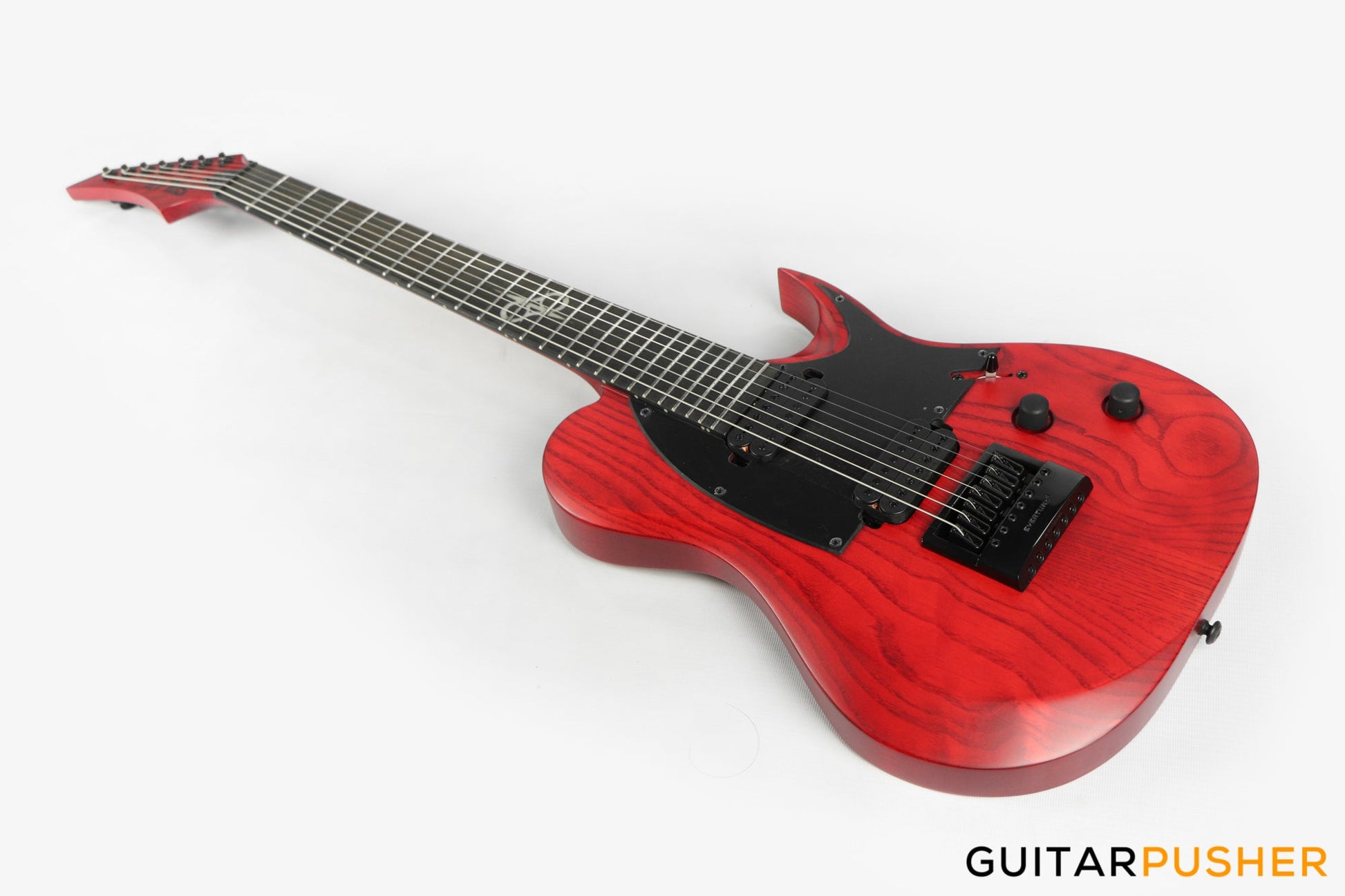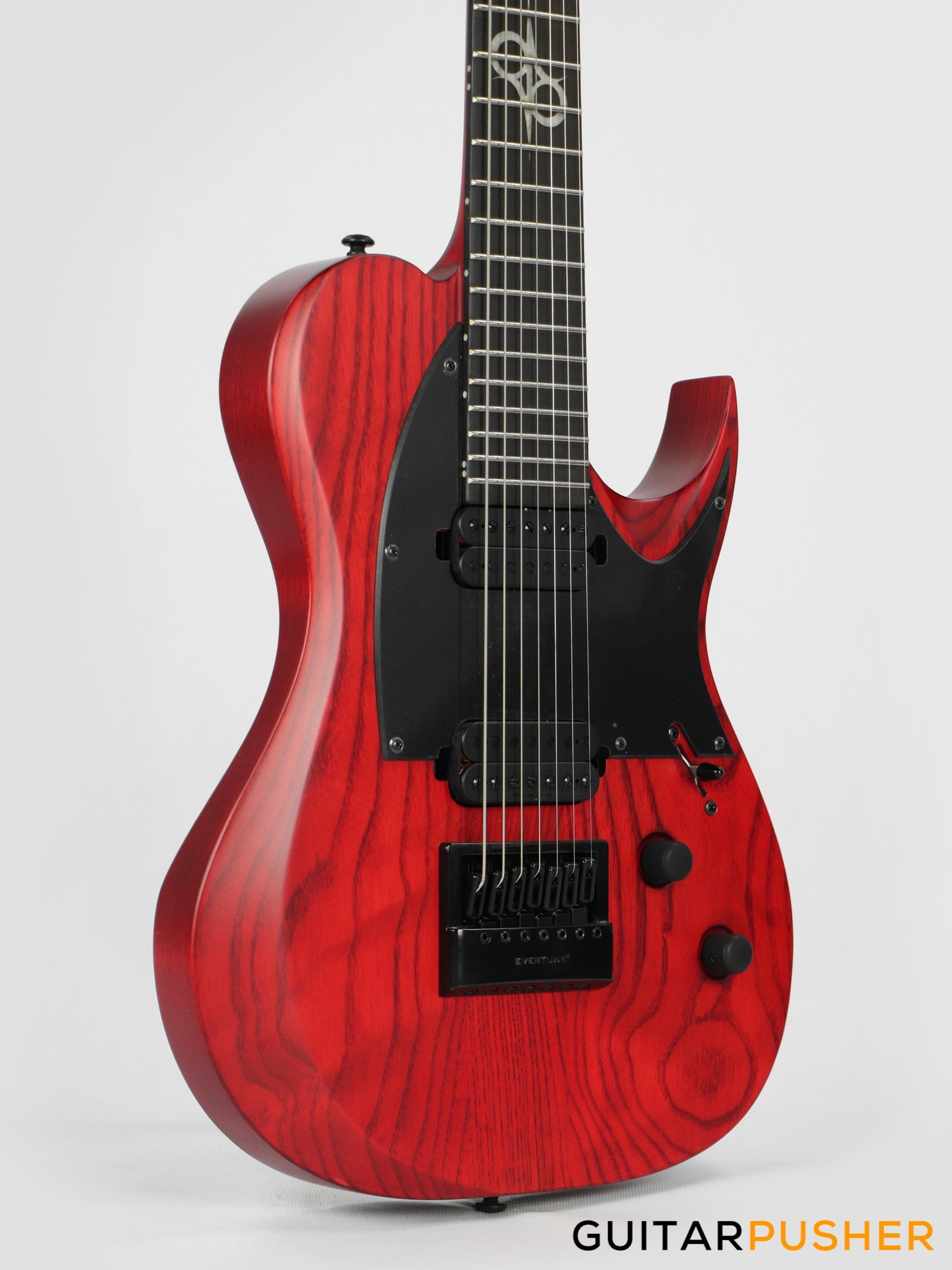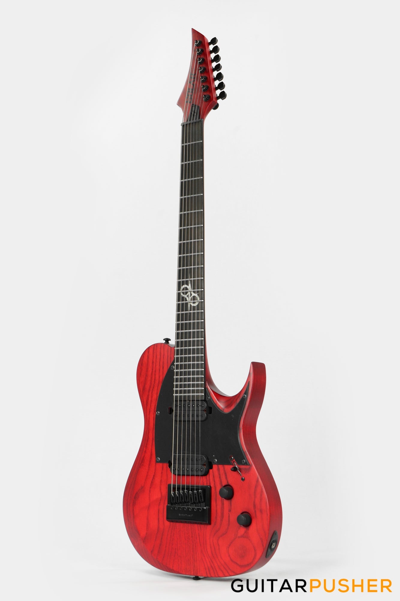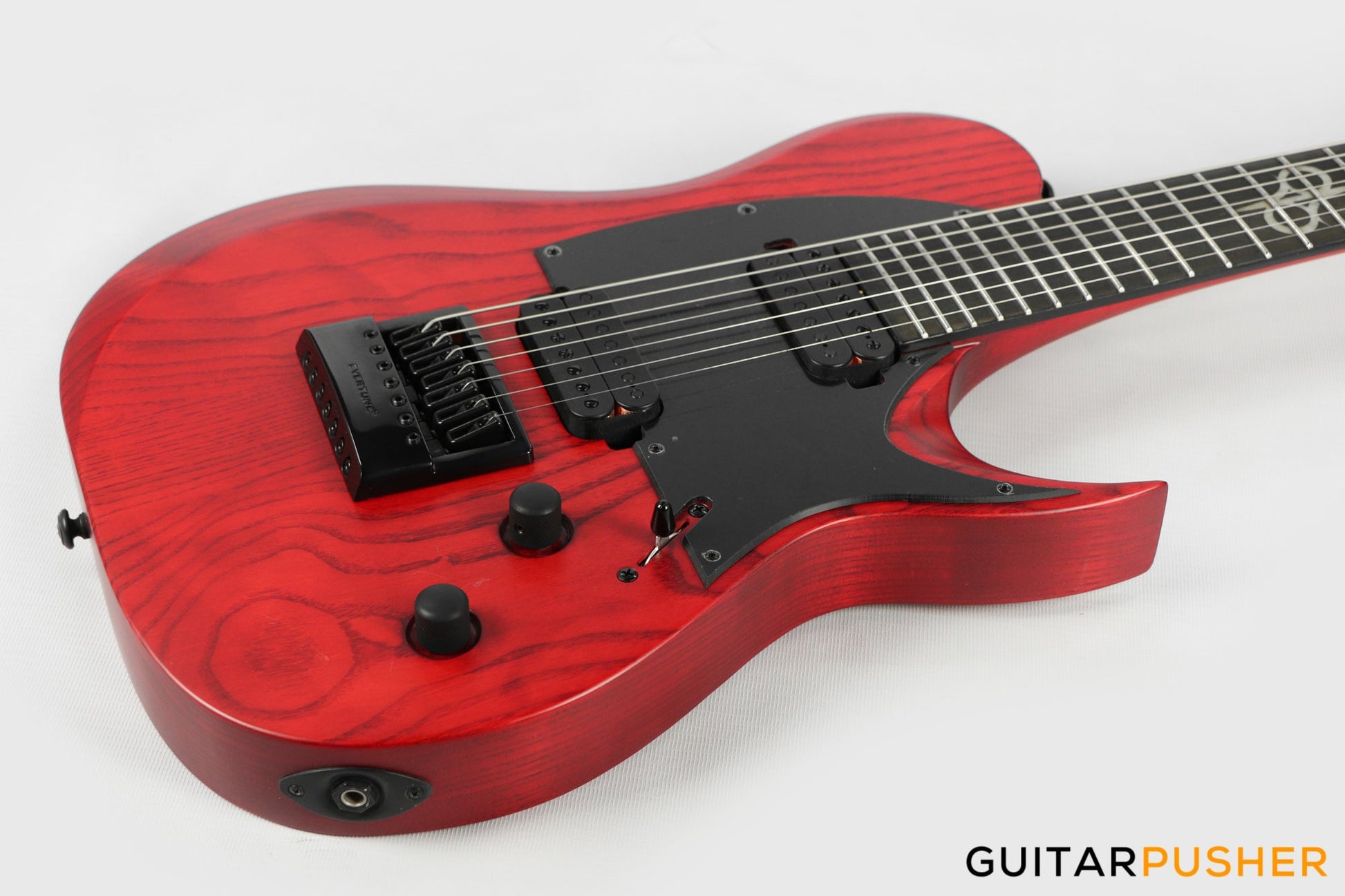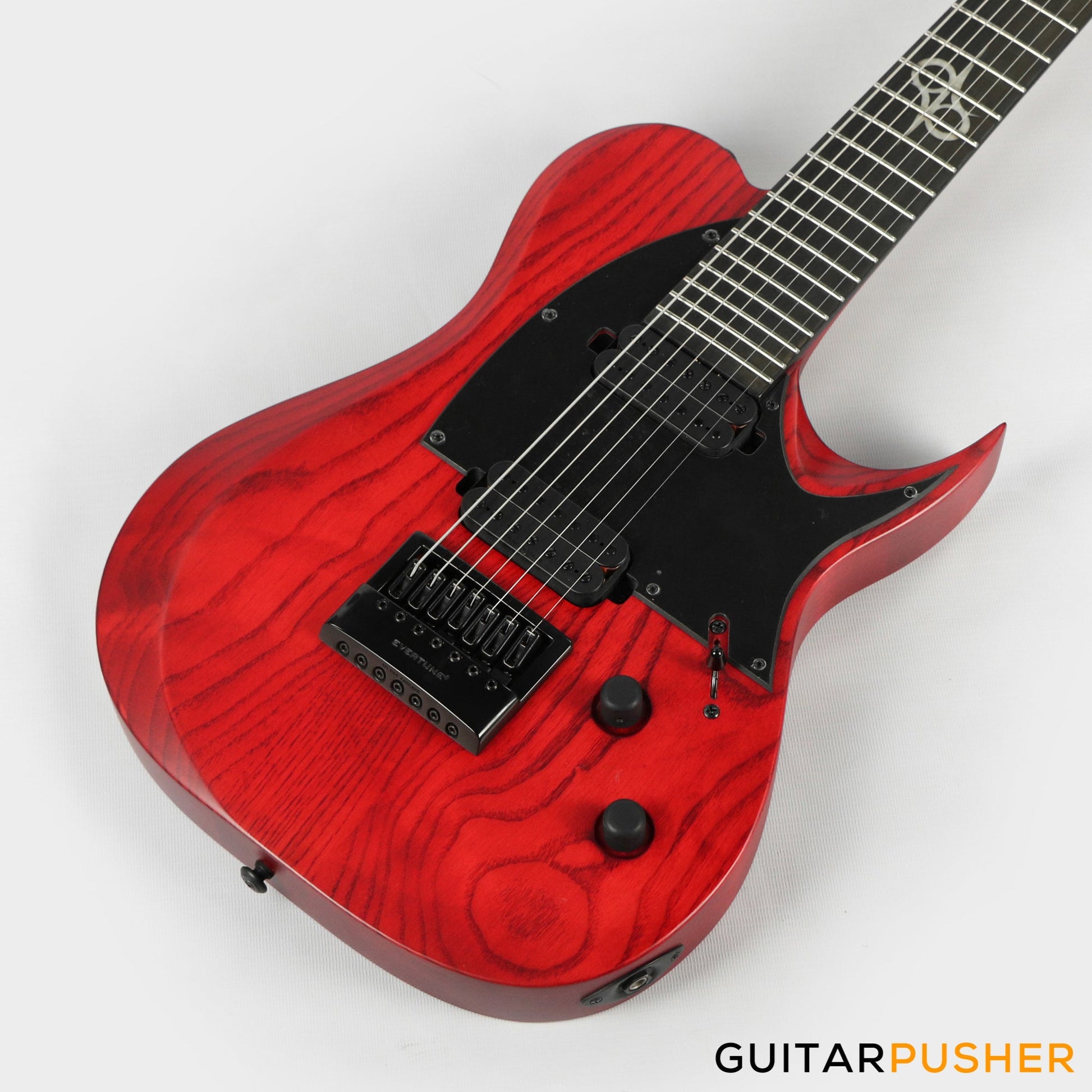 This Type T1.7TBR seven-string guitar with classy and elegant metal looks and distinctive and ergonomic arm rest bevel line stands out with a remarkable feature set, making it the ultimate, precise and professional instrument suitable for both stage and studio work. This guitar features the Evertune® constant-tension bridge—a reliable, fully-mechanical system that keeps the guitar in tune under any circumstances. It also features Duncan Solar pickups that provide a full spectrum of tonal options, from organic clean to heavily overdriven, all with fluid sustain and maximum clarity. The Type T1.7TBL features a set-thru neck/body joint design with 26.5” scale, a swamp ash body with pick guard, a fast, thin, comfortable maple neck, an ebony fingerboard with 24 stainless steel super-jumbo frets and luminlay ‘glow in the dark’ side dots for easy stage use. Loaded with Solar 18:1 locking tuners, graphite nut, five-way blade pickup switching and full access neck. Available in trans blood red matte finish.