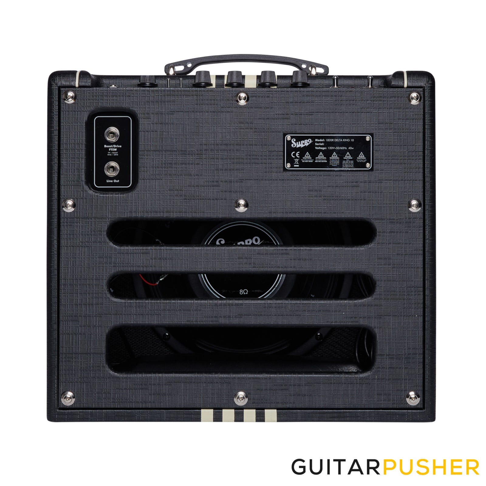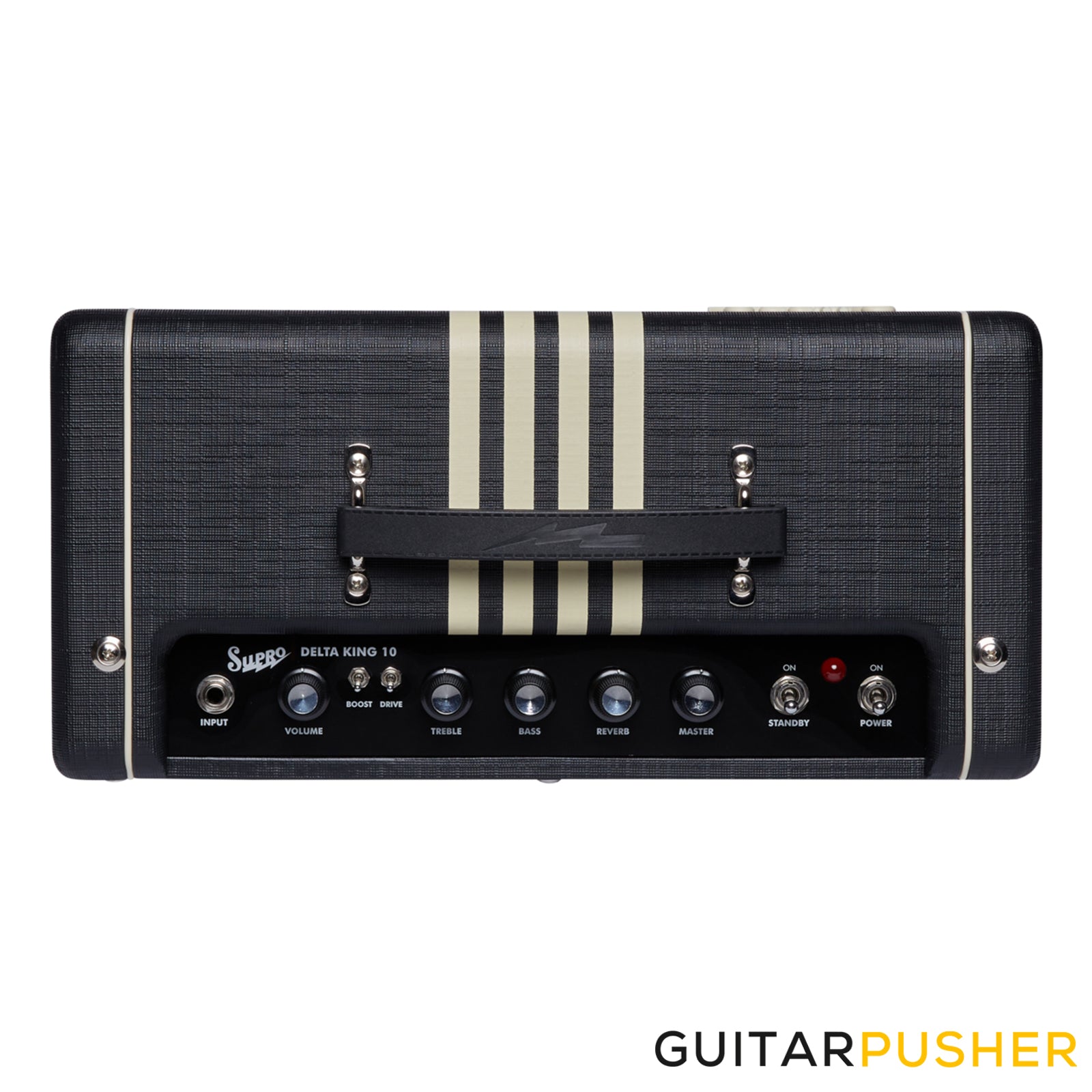 Hearkening back to the original Supro combo amplifiers, the Delta King 10 features a custom, poplar cabinet design, and two unforgettable colorways: custom tweed with black stripes, and black with cream stripes.