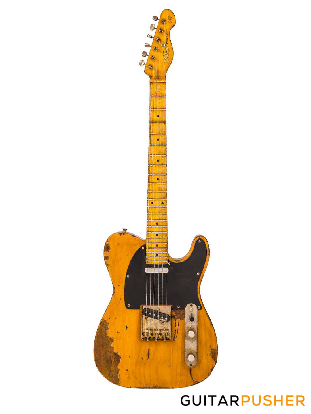 It’s the fine details like body lacquer checking, the rusty hue of the hardware and amber lacquered one-piece maple neck and fingerboard that make the Vintage V52 ProShop Unique Butterscotch, another hand-created one-off, ultra-realistic, heavily distressedguitar from the Vintage ProShop Team.