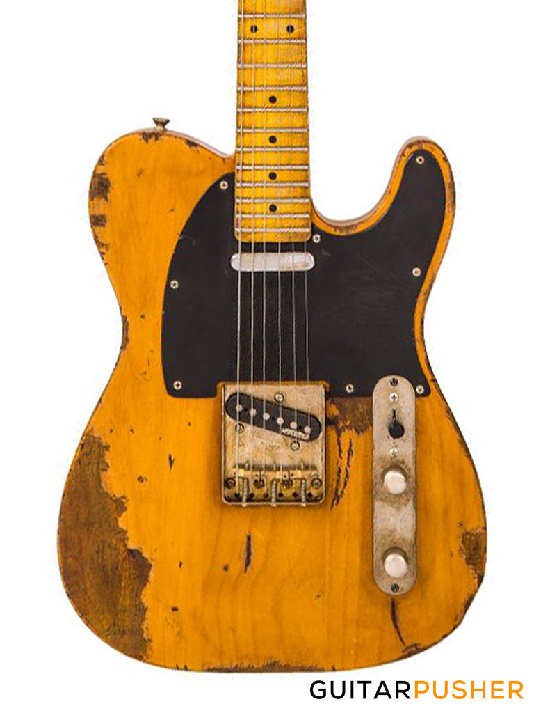 This is certainly a ‘player’s guitar’ right from the start, with the original Butterscotch finish taken back to the Eastern poplar body in all the correct friction-worn areas with hand tools, and like all hardware, has been re stained with a final clear acrylic coat.