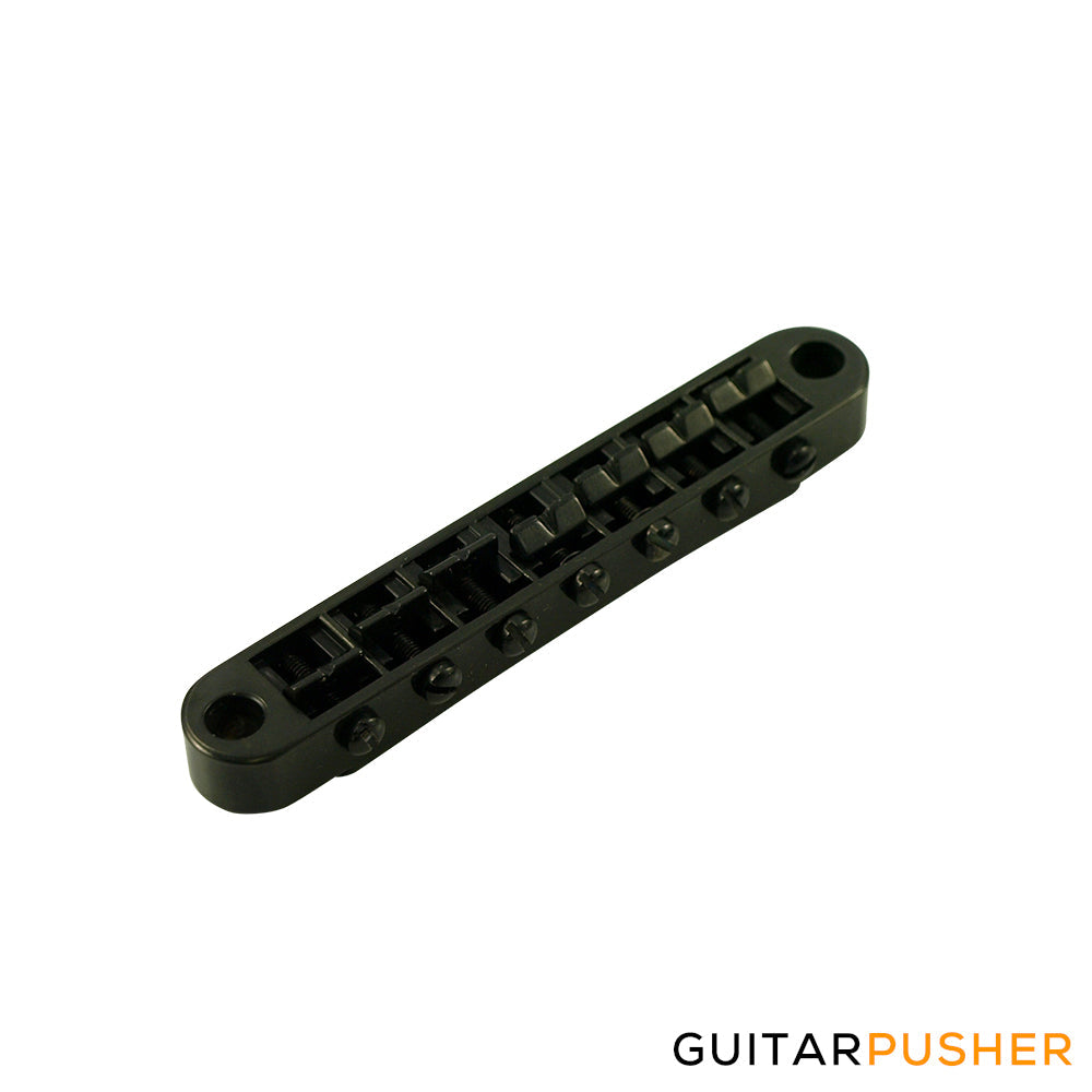This high quality 7-string tune-O-matic bridge will replace most metric OEM bridges using 6mm stud tops and equipped with body-mounted inserts. Includes adjustable saddles and increased intonation room comparable to the modern Nashville style bridge used by most guitar builders. Matching tailpiece available as GE1017Z part number.