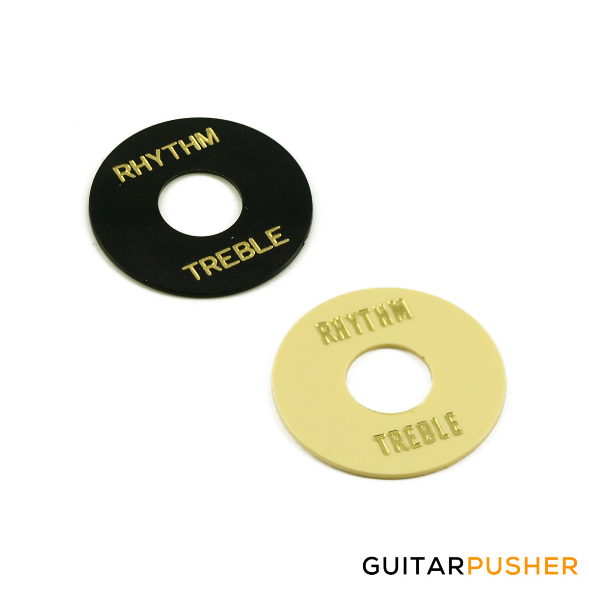 This rhythm treble ring is black, cream or white thin plastic with gold lettering in Metric Size. The self-adhesive backing makes it easy to apply under the washer and nut of a typical 3-way toggle switch.