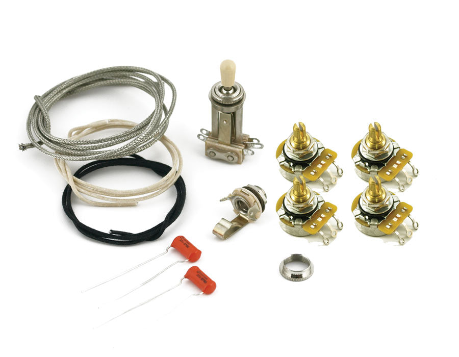 WD's upgraded wiring kit for SG style guitars. Compare to the other guys—these are the real deal. Genuine CTS potentiometers, Switchcraft switch, we even throw in that hard to find vintage dress nut for the switch. WD's wiring kits contain only the highest quality parts for building or repairing your guitar.