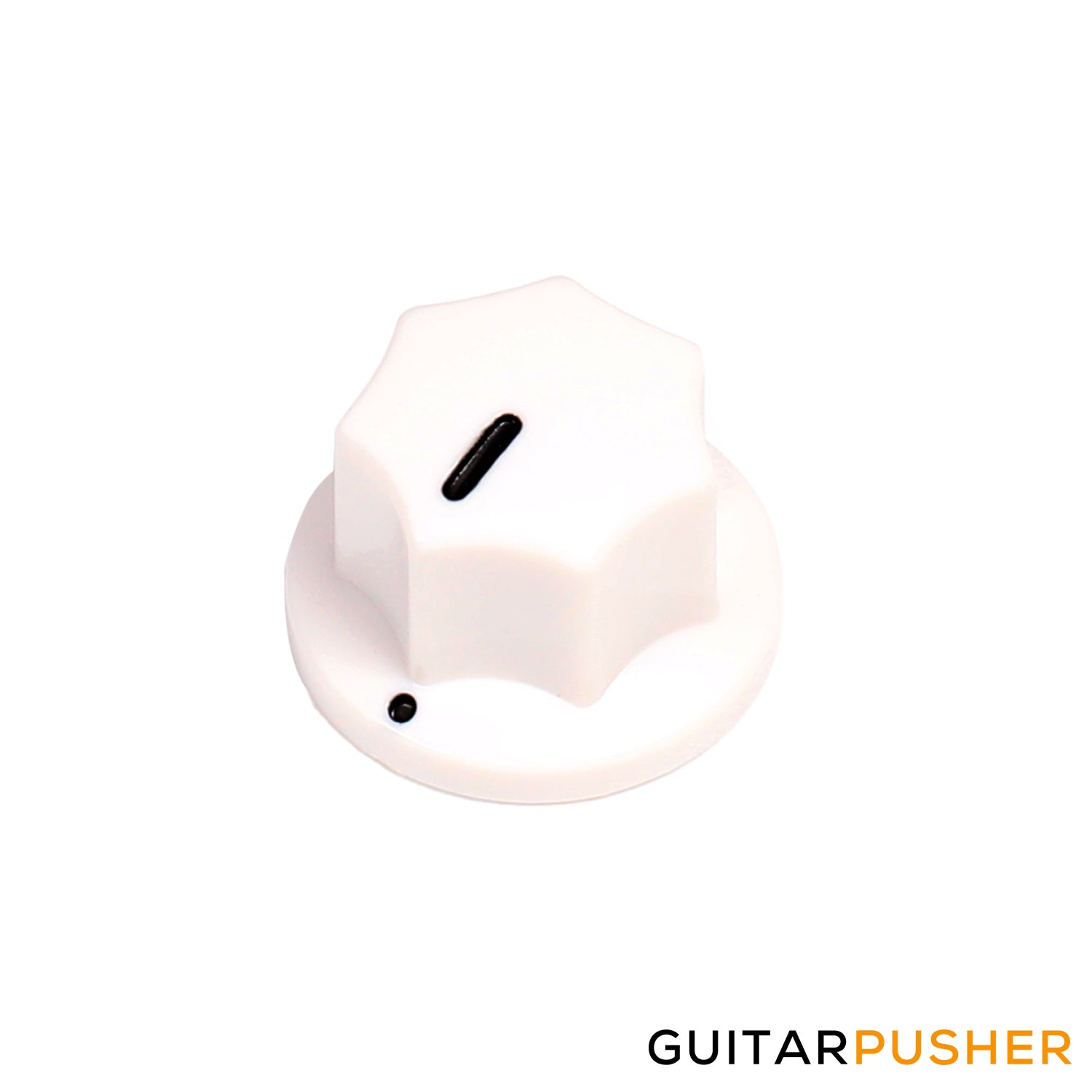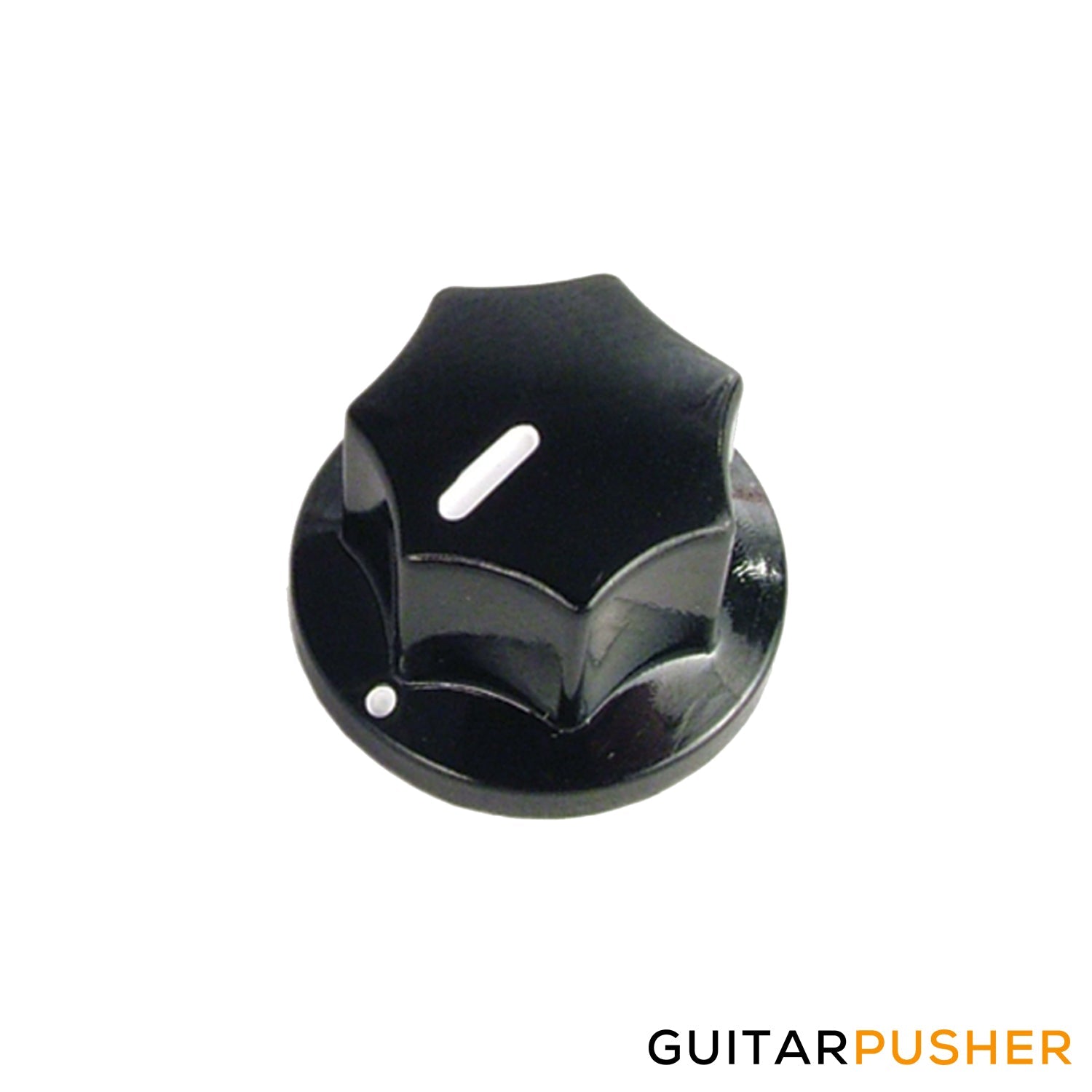 Small plastic knobs with set screw and brass insert. Similar to the small knobs used on many Dunlop / MXR pedals. These knobs have a fluted grip with an indicator line as well as a dot indicator on the skirt. Fits ¼” (6.35mm) pot shafts.