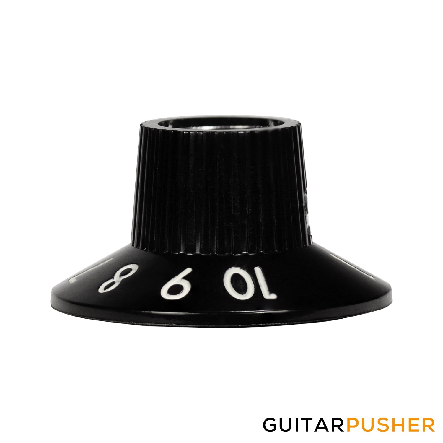 Black knob with white lettering, skirted, for blackface/silverface amps, with set screw, sold individually. Slightly thinner numbers than P-K314-1-A. Replacement for Fender: 099-0930-000